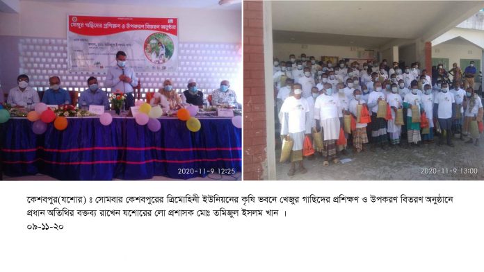 স্টাফ রিপোর্টার : খেজুরের ভেজালমুক্ত গুড়-পাটালি উৎপাদনের শপথ নিলেন যশোরের কেশবপুর উপজেলার ৭০ জন গাছি (গাছ থেকে রস-গুড়ের উৎপাদক)। গতকাল সোমবার সকালে কেশবপুরের ত্রিমোহিনী ইউনিয়ন পরিষদ চত্ত্বরে কৃষি কমপ্লেক্স মিলনায়তনে ‘বিশুদ্ধ খেজুর গুড় উৎপাদন বিষয়ক প্রশিক্ষণ ও উপকরণ বিতরণ’ অনুষ্ঠানে মুষ্টিবদ্ধ হাত তুলে গাছিরা এই শপথ নেন। যশোরের জেলা প্রশাসক মো. তমিজুল ইসলাম খান অনুষ্ঠানে প্রধান অতিথি হিসাবে গাছিদের এ শপথ বাক্য পাঠ করান। যশোরের পাঁচ তরুণ উদ্যোক্তার অনলাইন বাজার ‘কেনারহাট’ এ অনুষ্ঠানের আয়োজন করে। অনুষ্ঠানে সহযোগিতা দিয়েছে স্থানীয় সরকার বিভাগের এলজিএসপি প্রকল্প-৩।