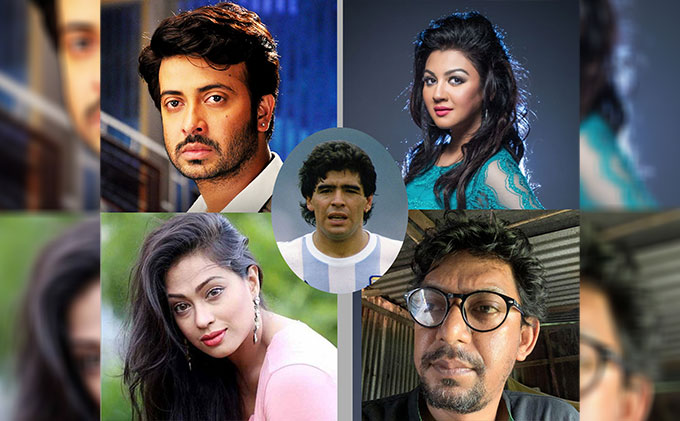 চঞ্চল চৌধুরী লিখেছেন, আমাদের কৈশরে, স্কুল জীবনে মিশে ছিল যে নামটি। ম্যারাডোনা। চলে গেলেন পরপারে। খুব বেশী করে ফিরে যাচ্ছি সেই অতীতে। ম্যারাডোনার ছবিওয়ালা খাতায় লিখতে লিখতেই, স্কুল জীবন পার করা। এখন কেমন লাগছে, অনেককেই বোঝানো যাবে না। আমাদের গ্রামে চেয়ারম্যানের বাড়িতে একমাত্র সাদাকালো টেলিভিশন। তখনও গ্রামে বিদ্যুতের আলো পৌছায়নি। ব্যাটারী চালিত সাদাকালো টেলিভিশনে রাত জেগে চেয়ারম্যান বাড়ির উঠোনে বিশ্বকাপ ফুটবল খেলা দেখা। কত কত স্মৃতি। তার আত্মার শান্তি হোক। আরিফিন শুভ লিখেছেন, একটি ইতিহাসের সমাপ্তি। শুভ বিদায় জাদুকর। আফরান নিশো লিখেছেন, রেস্ট ইন পিস দিয়াগো ম্যারাডোনা। নিরব লিখেছেন, ছোটবেলায় ফুটবল কি জানতামই না। শুধু জানতাম ফুটবল মানেই ম্যারাডোনা। কন্ঠশিল্পী আঁখী আলমগীর লিখেছেন, রেস্ট ইন পিস দিয়াগো ম্যারাডোনা। খুব দ্রুতই চলে গেলে। ক্লোজআপ তারকা সাজিয়া সুলতানা পুতুল লেখেন, যাদুকর কাকে বলে? যখন একজন মানুষ তার কারণে পৃথিবীর কোটি মানুষকে তার দেশটিকে চিনিয়ে দিতে পারেন, পারেন তারই মতো ক্ষ্যাপাটে অনুরাগীতে পরিণত করতে, পারেন চূড়ান্ত ব্যর্থতাতেও সেই দেশের সমর্থন ছেড়ে অন্য কোনো দলের অনুরাগী না হতে বাধ্য করতে, পারেন প্রজন্মের পর প্রজন্মে তার দেশের নামটিকে বুকে গাঁথিয়ে নিতে, পারেন শিরোপার দৌড়ে পিছিয়ে থেকেও গলা উঁচিয়ে সমর্থকদের কথা বলিয়ে নিতে, পারেন তার দেশ থেকে হাজার মাইল দূরের দেশের ছোট্ট গ্রামের চায়ের দোকান বা বাড়ির ছাদে তার দেশের পতাকা টানিয়ে নিতে! তবে সেই মানুষটিকে ম্যারাডোনা হতে হয়! ফুটবলবিশ্বের সবচেয়ে আদুরে আর পাগলাটে আর ক্ষ্যাপাটে আর অভিমানী নাম, বিদায়! গতকাল ৬০ বছর বয়সে না ফেরার দেশে পাড়ি জমান ম্যারাডোনা। তিনি হার্ট অ্যাটাকে মারা গেছেন।