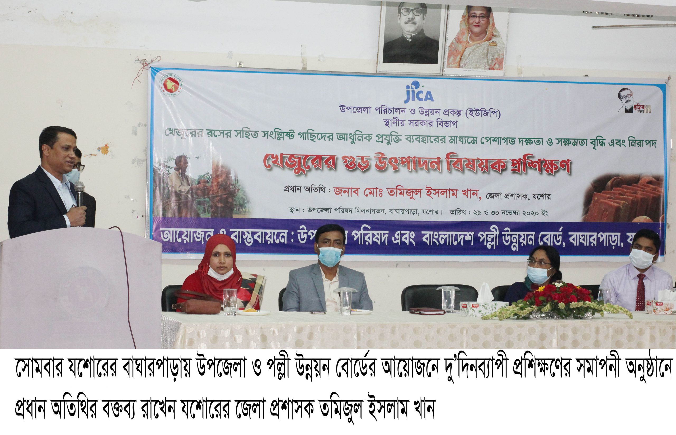 সোমবার (৩০ নভেম্বর) বেলা ১২টার দিকে খেজুরের গুড়-পাটালি উৎপাদন বিষয়ক প্রশিক্ষণ কর্মশালার সমাপনীতে প্রধান অতিথির বক্তৃতায় যশোরের জেলা প্রশাসক মো. তমিজুল ইসলাম খান এসব কথা বলেন।