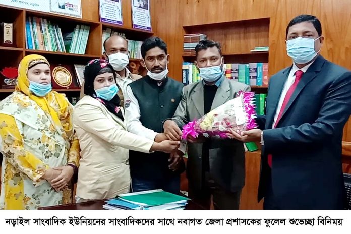 পরে নবাগত জেলা প্রশাসককে ফুলেল শুভেচ্ছা জানান স্থানীয় নড়াইল সাংবাদিক ইউনিয়নের প্রিন্ট ও ইলেকট্রনিক্স মিডিয়ার সদস্যরা।