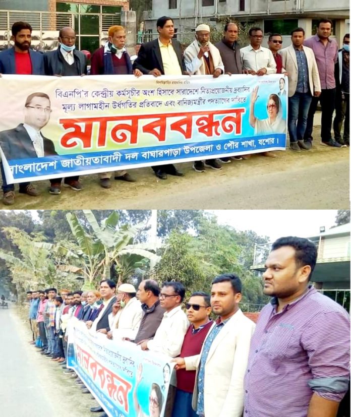 বৃহশপতিবার বিকালে অনুষ্ঠিত এ মানবন্ধন কর্মসূচীত উপস্থিত ছিলেন বাঘারপাড়া বিএনপির যুগ্ম আহবায়ক-১ শামছুর রহমান, যুগ্ম আহবায়ক-২ সাবেক উপজেলা চেয়ারম্যান মসিয়ুর রহমান ও বাঘারপাড়া পৌর বিএনপির আহবায়ক আব্দুল হাই মনা সহ বিএনপির ইউনিয়ন কমিটি, যুবদল, কৃষকদল ও ছাত্রদলের নেতা-কর্মীবৃন্দ। মানবন্ধনে অংশগ্রহণকারী নেতৃবৃন্দ নিত্যপ্রয়োজনীয় দ্রব্যের লাগামহীন মূল্য বৃদ্ধির তীব্র প্রতিবাদ জানান এবং দ্রব্য মূল্য সহনীয় রাখার ক্ষেত্রে ব্যর্থতার দায়ে বানিজ্য মন্ত্রীরর পদত্যাগ দাবী করেন।