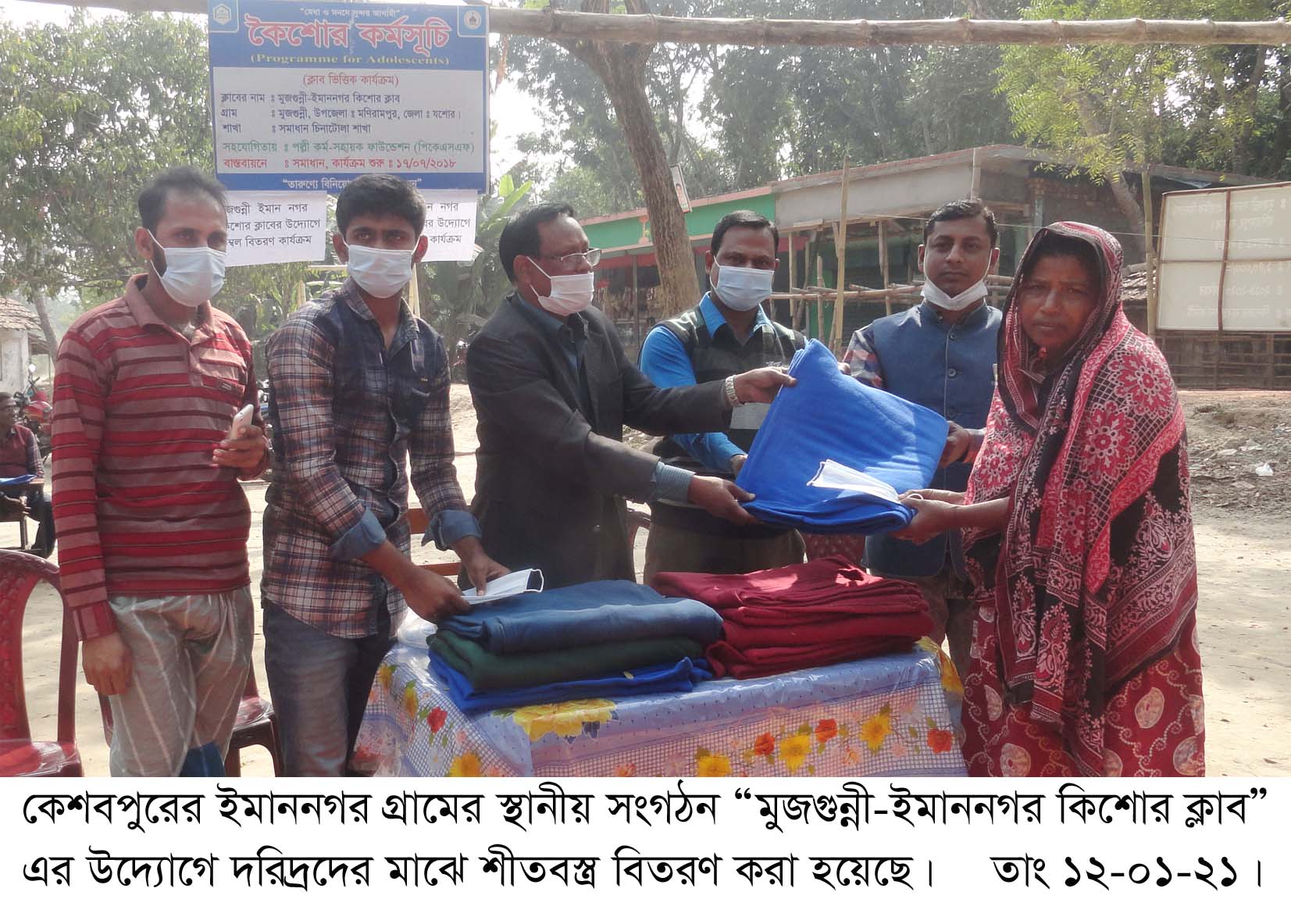 ভ্রাম্যমান প্রতিনিধি, কেশবপুর :কেশবপুর উপজেলার ইমাননগর গ্রামের স্থানীয় সংগঠন “মুজগুন্নী-ইমাননগর কিশোর কাব” এর নিজস্ব উদ্যোগে মুজগুন্নী সরকারি প্রাথমিক বিদ্যালয় মাঠে দরিদ্রদের মাঝে মঙ্গলবার দুপুরে শীতবস্ত্র বিতরণ করা হয়েছে। পল্লী কর্ম-সহায়ক ফাউন্ডেশন (পিকেএসএফ) এর অর্থায়নে ও সমাধান সংস্থার বাস্তবায়নে “কৈশোর কর্মসূচি”র আওতায় গঠিত কাব কর্তৃক গৃহিত বিভিন্ন সামাজিক কার্যক্রমের অংশ হিসেবে কাবের নিজস্ব তহবিল থেকে এই উদ্যোগ গ্রহন করা হয়েছে।