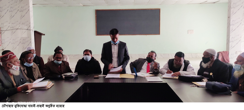 শনিবার বেলা সাড়ে ১০টায় উপজেলা মুক্তিযোদ্ধা যাচাই-বাছাই কমিটির সভাপতি ও উপজেলা মুক্তিযোদ্ধা ঐক্য পরিষদের সভাপতি সাবেক সোনালী ব্যাংক কর্মকর্তা আব্দুস সালামের সভাপতিত্বে যাচাই-বাছাই কার্যক্রমের শুরু হয়। প্রথমেই চৌগাছা উপজেলা নির্বাহী অফিসার ও মুক্তিযোদ্ধা যাচাই-বাছাই কমিটির সদস্য সচিব প্রকৌশলী এনামুল হক বীর মুক্তিযোদ্ধাদের যাচাই-বাছাইয়ের নীতিমালা উপস্থিত মুক্তিযোদ্ধা ও মরহুম মুক্তিযোদ্ধাদের স্বজনদের পড়ে শুনান এবং নির্দেশনা মুলক বক্তব্য রাখেন। এরপর যাচাই-বাছাই কমিটির সভাপতি আব্দুস সালামের সভাপতিত্বে যাচাই-বাছাই কার্যক্রম শুরু হয়। যাচাই-বাছাইয়ে উপজেলার বীর মুক্তিযোদ্ধা জগদীশপুর গ্রামের শামছুল হক (বেসামরিক গেজেট-১৭৮৯), সৈয়দপুর গ্রামের রেজাউল ইসলাম (বেসামরিক গেজেট-১৭৯৮) ও জুমহিউদ্দীন (বেসামরিক গেজেট-১৮১২), দক্ষিণ সাগর গ্রামের চকম আলী (বেসামরিক গেজেট-১৮৪২), মাড়ুয়া গ্রামের সিরাজুল ইসলাম (বেসামরিক গেজেট-১৮৪৬), জগদীশপুর গ্রামের শহিদুল ইসলাম (বেসামরিক গেজেট-১৮৪৭), রামকৃষ্ণপুর গ্রামের গোলাম কবীর (বেসামরিক গেজেট-১৮৭৭), হোগলডাঙ্গা গ্রামের আব্দুস সাত্তার (বেসামরিক গেজেট-১৮৯০), বেড়গোবিন্দপুর গ্রামের আসাদুজ্জামান (বেসামরিক গেজেট-১৮৯৬), দুর্গাবরকাঠি গ্রামের সামসুজ্জামান (বেসামরিক গেজেট-১৯০০), আন্দারকোটা গ্রামের নুরুল আমিন (বেসামরিক গেজেট-২৬০০), বেড়গোবিন্দপুর গ্রামের আবু বকর (বেসামরিক গেজেট-২৬০১), শফিউদ্দীন (বেসামরিক গেজেট-২৬০২), ওলিয়ার রহমান (বেসামরিক গেজেট-২৬০৩) ও ওয়াজেদ আলী (বেসামরিক গেজেট-২৬০৪), দিঘলসিংগা গ্রামের আতিয়ার রহমান সর্দার (বেসামরিক গেজেট-২৬০৯) এবং মাঝালী গ্রামের মশিয়ার রহমানের (বেসামরিক গেজেট-২৬১৭) স্বপক্ষে তাদের সহযোদ্ধাদের স্বাক্ষ্য গ্রহণ করা হয়। তবে সময় প্রার্থনা করে আবেদন করায় চকম আলী ও মশিয়ার রহমানের যাচাই-বাছাই আগামী সোমবার বিকালে অনুষ্ঠিত হবে। যাচাই-বাছাইয়ের আওতাভুক্ত মরহুম মুক্তিযোদ্ধাদের পক্ষে স্বজনরা উপস্থিত ছিলেন।