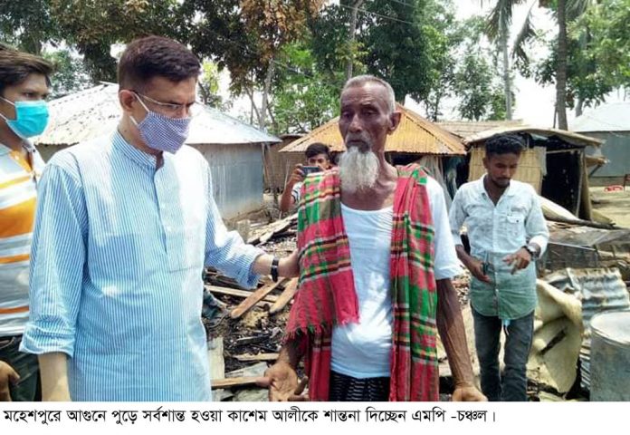 মহেশপুর(ঝিনাইদহ)অফিসঃ উপজেলার খড়ে মান্দারতলা গ্রামে আগুনে পুড়ে যাওয়া ঘটনাস্থল পরিদর্শন করেন স্থানীয় এমপি চঞ্চল। সোমবার রাতে ঐ গ্রামের ৩টি দরিদ্র পরিবারের বসতবাড়ি আগুনে পুড়ে ছাই হয়ে যায়।