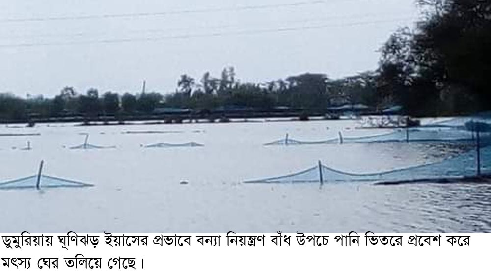 ভ্রাম্যমান প্রতিনিধি,চুকনগর ঃ খুলনার ডুমুরিয়ায় ঘূর্ণিঝড় ইয়াস’র প্রভাবে জোয়ারের পানিতে নদীর তীরবর্তী উপকূলীয় এলাকার প্রায় দেড় হাজার ঘের প্লাবিত হয়েছে। বুধবার দুপুরের দিকে শুরু হওয়া জোয়ারের পানি ধীরে ধীরে প্রবেশ করতে শুরু করে। এরপর ধীরে ধীরে বন্যা নিয়ন্ত্রণ বাঁধ ভেঙ্গে তুমুল গতিতে ভিতরে পানি প্রবেশ করতে শুরু করে। সন্ধ্যার ভিতরে প্রায় দেড় হাজার মৎস্য ঘের পানিতে তলিয়ে যায়। এছাড়া বাঁধ উপচে ও স্লুইচ গেট দিয়ে জোয়ারের পানি প্রব্শে করে উপজেলার মাগুরাখালি, শরাফপুর, শোভনা, সাহস, খর্ণিয়া, রুদাঘোরা ইউনিয়নের চিংড়ি ও মাছের ঘের তলিয়ে গেছে। এব্যাপারে উপজেলা সিনিয়র মৎস্য অফিসার মোঃ আবু বক্কর সিদ্দিক বলেন, উপজেলার ৬টি ইউনিয়নের প্রায় ১৮০০হেক্টর আয়তনের ২৬৫০টি ঘের জোয়ারের পানিতে ভেসে গেছে। এতে প্রায় ১০কোটি টাকার য়তি হয়েছে বলে জানান তিনি। জেলা মৎস্য কর্মকর্তা (ডিএফও) মোঃ আবু সাইদ বলেন, জেলার প্রধান নদ নদী গুলোতে জোয়ারের পাানি বৃদ্ধি পাওয়ায় উপকূলীয় দাকোপ, বটিয়াঘাটা, ডুমুরিয়া, পাইকগাছা ও কয়রা উপজেলার কিছু এলাকায় বাঁধ উপচে ও স্লুইচ গেট দিয়ে ভিতরে পানি প্রবেশের সংবাদ পেয়েছি। এতে মৎস্য ঘের তলিয়ে গেছে। একারণে জেলার কতগুলো মৎস্য ঘের ভেসে গেছে ও য়তি হয়েছে সে সংক্রান্ত তথ্য সংগ্রহের জন্য ইতিমধ্যে উপজেলা মৎস্য কর্মকর্তাগনদের নির্দেশ দেয়া হয়েছে।