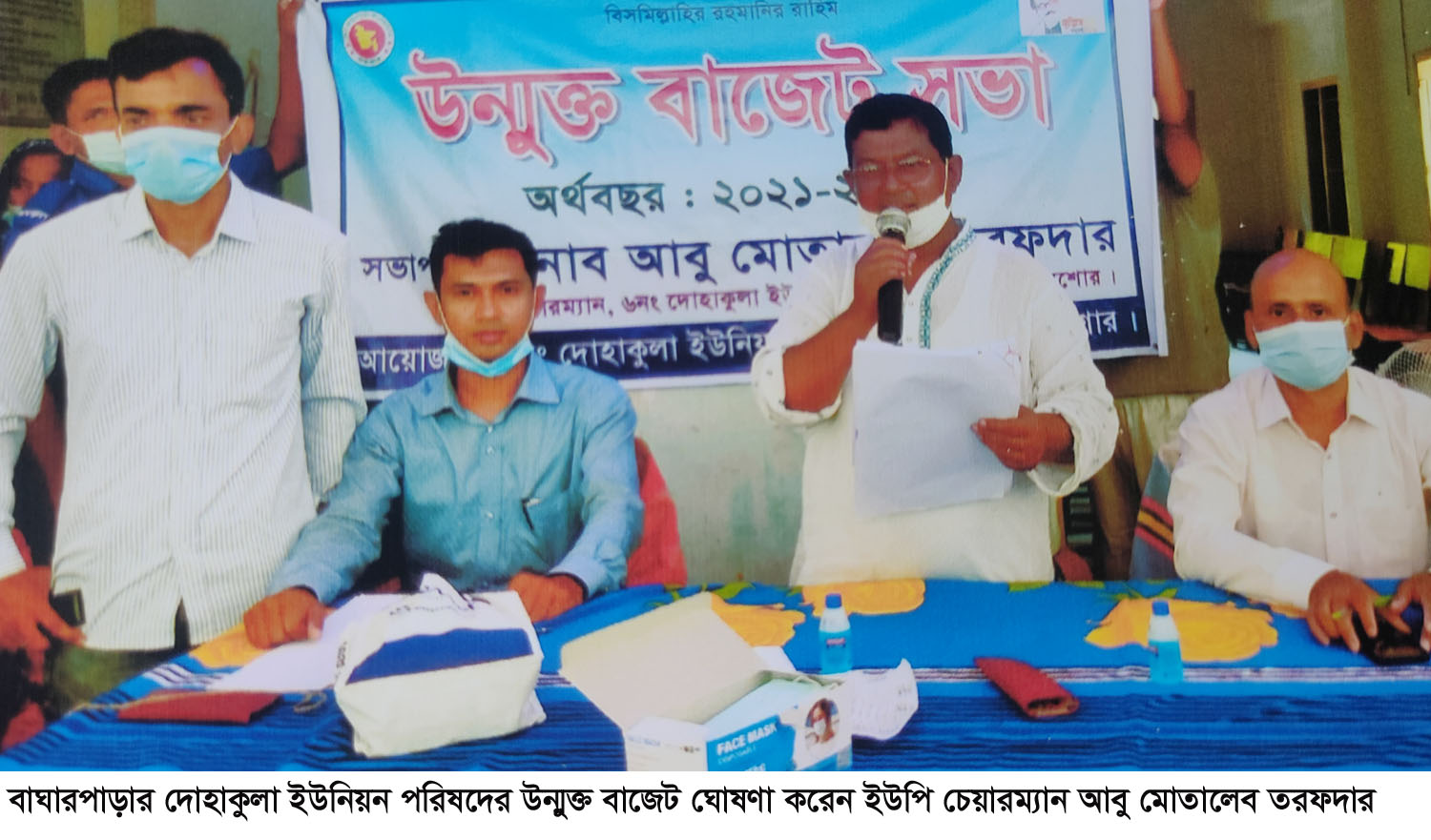 বাঘারপাড়া (যশোর) প্রতিনিধি: বাঘারপাড়ার দোহাকুলা ইউনিয়ন পরিষদের ২০২১-২২ অর্থ বছরের উন্মুক্ত বাজেট রবিবার সকালে পরিষদের সভাকক্ষে ঘোষনা করা হয়েছে। পরিষদের চেয়ারম্যান আবু মোতালেব তরফদার বিভিন্ন শ্রেণি -পেশার মানুষের উপস্থিতিতে উন্মুক্ত বাজেট ঘোষনা করেন। বাজেটে আয় ধরা হয়েছে ১ কোটি ৬৭ লাখ ৭৯ হাজার ৭শ’৯১। ব্যয় দেখানো হয়েছে ১ কোটি ৬৭ লাখ ৭৯ হাজার। উদ্বৃত্ত ৭শত ৯১ টাকা। বাজেট সভায় বক্তব্য রাখেন সহকারি শিক্ষা কর্মকর্তা অজিত কুমার বিশ্বাস, ইউপি সচিব সাইদুর রহমান, ইউপি সদস্য বুরহান উদ্দীন, তরিকুল ইসলাম, রাবেয়া খাতুন, লতিফা খাতুন প্রমুখ।