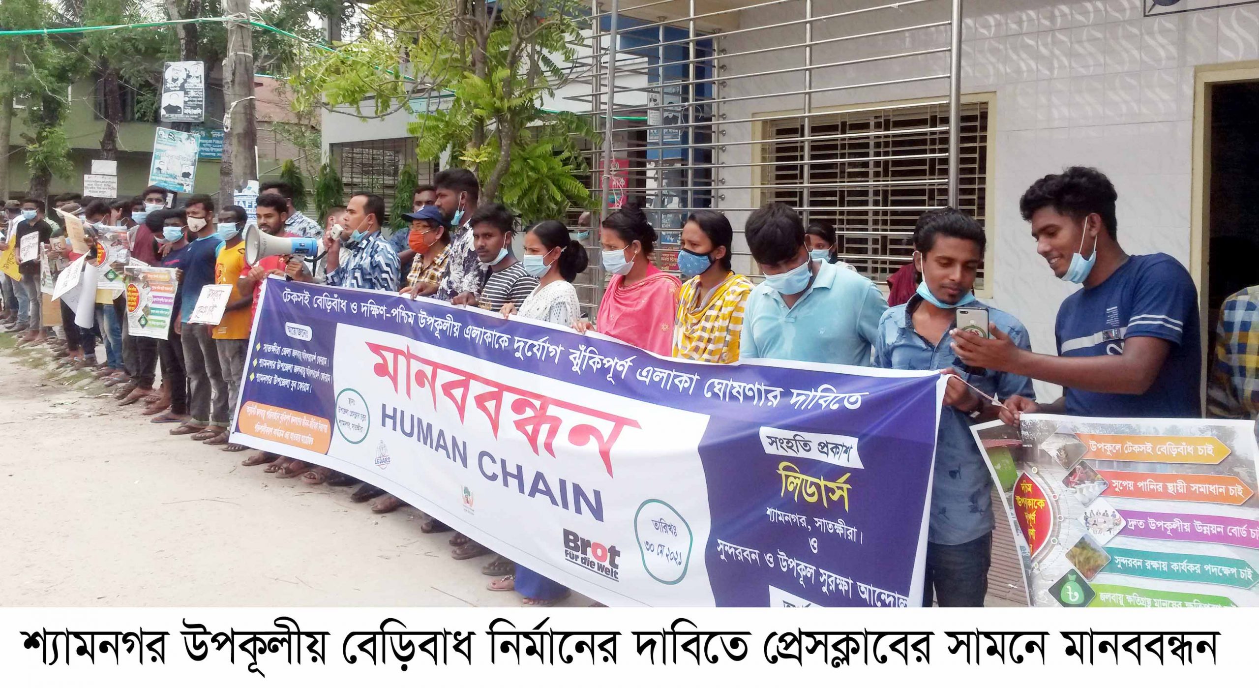 শ্যামনগর ব্যুরো ঃ ঘূর্ণিঝড় ‘ইয়াস’ এর আঘাতে শ্যামনগর উপক‚লীয় এলাকার মানুষের নিরাপত্তার লক্ষ্যে সাতক্ষীরা জেলা জলবায়ু অধিপরামর্শ ফোরাম, শ্যামনগর উপজেলা অধিপরামর্শ ফোরাম ও শ্যামনগর উপজেলা যুব ফোরাম এর আয়োজনে উপক‚লীয় সুরক্ষা আন্দোলন কমিটির সহযোগিতায় এবং ব্রেড ফর দ্যা ওয়ার্ল্ড এর অর্থায়নে টেকসই বেড়িবাধ ও দক্ষিন পশ্চিম উপক‚লীয় এলাকাকে দুর্যোগ ঝুঁকিপূর্ন এলাকা ঘোষনার দাবিতে এবং ম্যানগ্রোভ স্টুডেন্ট সোসাইটির সাধারন সম্পাদক শাহীন বিল্লাহ কে লাঞ্চিতকারীদের বিরুদ্ধে সু-বিচারের দাবিতে মানববন্ধন অনুষ্ঠিত হয়েছে। গতকাল ৩০ মে সকাল ১১ টায় শ্যামনগর উপজেলা প্রেসক্লাবের সামনে মানববন্ধন চলাকালে বক্তব্য রাখেন মুক্তিযোদ্ধা মাস্টার নজরুল ইসলাম, সাংবাদিকদের পক্ষে এম কামরুজ্জামান, অধ্যাপক মানবেন্দ্র দেবনাথ, বাংলাদেশ হিন্দু পরিষদ শ্যামনগরের আহবায়ক অনাথ মন্ডল এবং অংশগ্রহনকারী সংস্থার নেতাকর্মীগণ। বক্তাগণ এ মানববন্ধনের মাধ্যমে শ্যামনগর উপক‚লীয় এলাকার মানুষের নিরাপত্তার লক্ষ্যে টেকসই বেড়িবাধ নির্মান ও ম্যানগ্রোভ স্টুডেন্ট সোসাইটির সাধারন সম্পাদক শাহীন বিল্লাহকে লাঞ্চিতকারী এসও আলমগীর কবীর ও ইউপি চেয়ারম্যান আতাউর রহমানের বিরুদ্ধে সুষ্ঠু বিচারের দাবি জানায় বক্তাগণ।