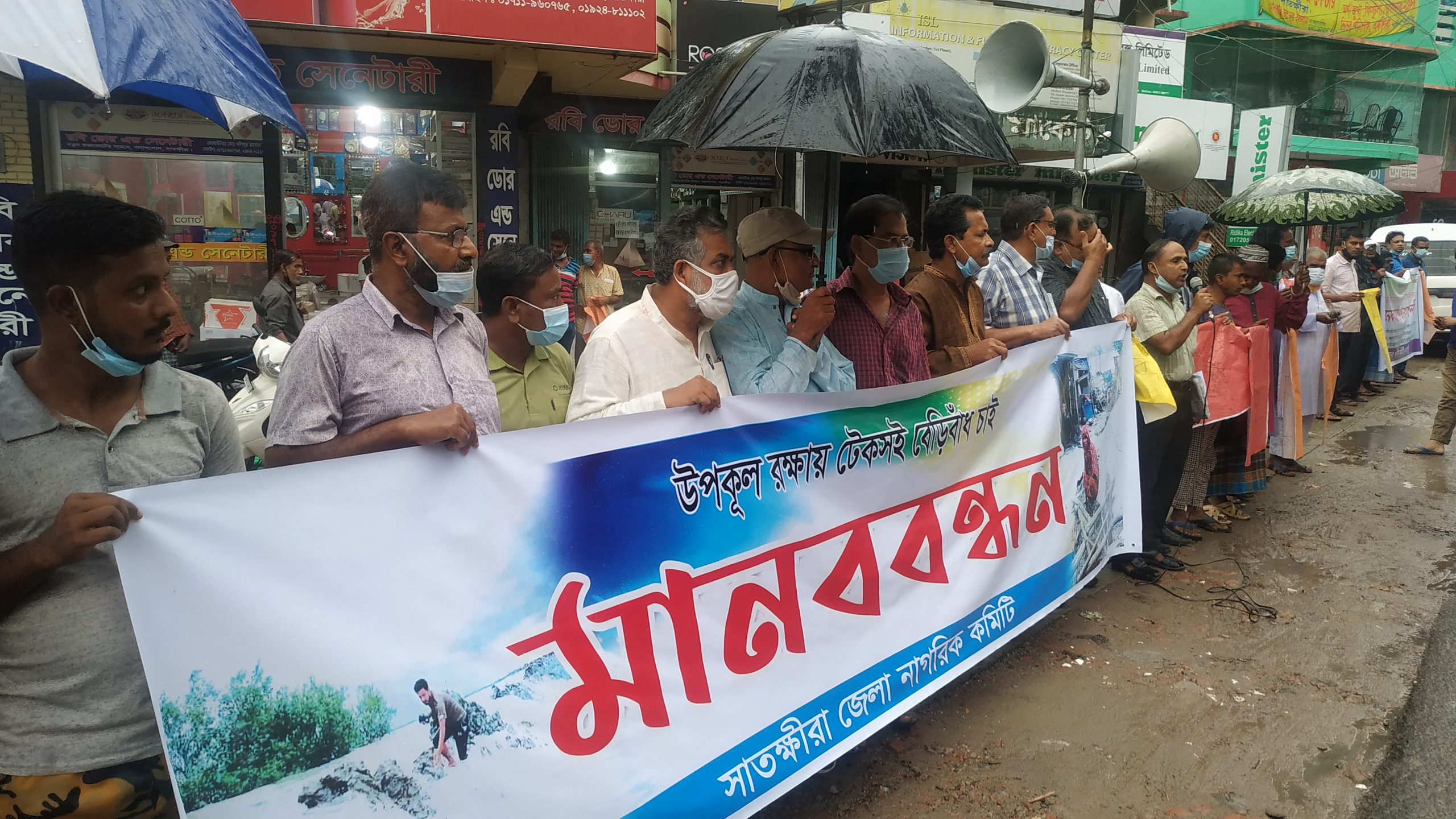 উপকূল রক্ষায় টেকসই বেড়িবাঁধের দাবিতে সাতক্ষীরায় মানববন্ধন