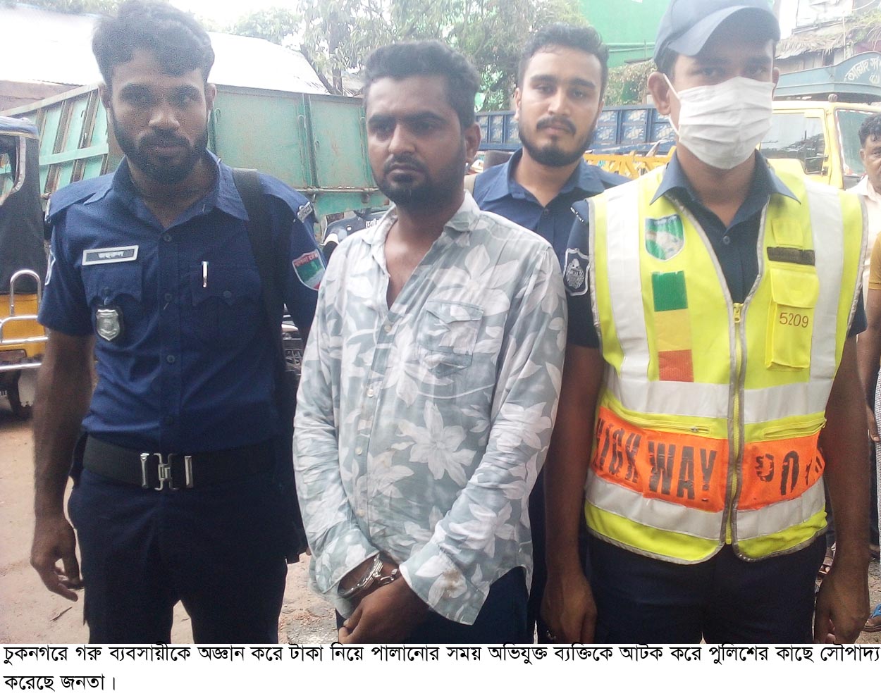 পুলিশ ও প্রত্যদর্শী সূত্রে জানা যায়, খুলনা থেকে ছেড়ে আসা একটি যাত্রীবাহী বাস সোমবার বিকাল সাড়ে ৩টার দিকে চুকনগর বাসষ্ট্যান্ডে পৌছুলে সাতীরা জেলার তালা উপজেলার খলিশখালী গ্রামের মোজের আলীর পুত্র মোঃ আব্দুস সবুজ কালাম (৩২) নামে এক অজ্ঞান পার্টির সদস্য যাত্রীবাহী বাস থেকে নেমে দৌঁড়ে পালানোর সময় খুলনার মিস্ত্রী পাড়ার মৃত আসাদ আলী শেখের পুত্র আবুল খায়ের শেখ নামে এক গরু ব্যবসায়ী অজ্ঞান কাজের সাথে অভিযুক্ত ব্যক্তির পিছনে চোর চোর বলে দৌঁড়াতে থাকে। এসময় তার আত্তচিৎকারে জনতা তাকে অভিযুক্ত ব্যক্তিতে ধরে ফেলে। পরে জনতার রোষানল থেকে বাঁচানোর জন্য খর্ণিয়া হাইওয়ে থানা পুলিশের কাছে তাকে হস্তান্তর করা হয়। এসময় গরু ব্যবসায়ী অজ্ঞান হয়ে মাটিতে লুটে পড়ে। পুলিশ অভিযুক্ত ব্যক্তির কাছ থেকে নগত ৭৬হাজার ৯শত টাকা, অজ্ঞান করা মেডিসিন, একটি হ্যান্ডওয়াশ, একটি মোবাইল ফোন ও একটি ল্যাপটপ জব্দ করে। এব্যাপারে খর্ণিয়া হাইওয়ে থানা পুলিশের ভারপ্রাপ্ত কর্মকর্তা (ওসি) মোঃ নাসির উদ্দীন মজুমদার বলেন, ধৃত ব্যক্তিতে ডুমুরিয়া থানা পুলিশের কাছে হস্তান্তর করা হয়েছে এবং অসুস্থ অজ্ঞান গরু ব্যবসায়ীকে ডুমুরিয়া উপজেলা স্বাস্থ্য কমপ্লেক্্ের ভর্তি করা হয়েছে।