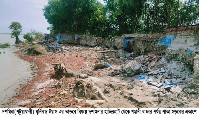 দশমিনা (পটুয়াখালী) সংবাদদাতা : পটুয়াখালীর দশমিনা উপজেলায় ঘূর্নিঝড় ইয়াস এর তান্ডবে পাকা সড়ক যোগাযোগ ব্যবস্থার ব্যাপক ক্ষতি হয়। পানি কমে যাওয়ার পর বেড়িয়ে আসছে সড়ক গুলোর ক্ষত চিহৃ। স্থানীয় জনগন ভেঙে যাওয়া সড়ক গুলোতে মাটি বালু ফেলে যাতায়াত ব্যবস্থা কিছুটা চালু রাখার চেষ্টা করেও ব্যর্থ হচ্ছেন। স্থানীয় সংসদ সদস্য এস এম শাহজাদা গত রোববার বিধ্বস্ত পাকা সড়কগুলো দ্রæত সংস্কার করার প্রতিশ্রæতি দিয়েছেন।