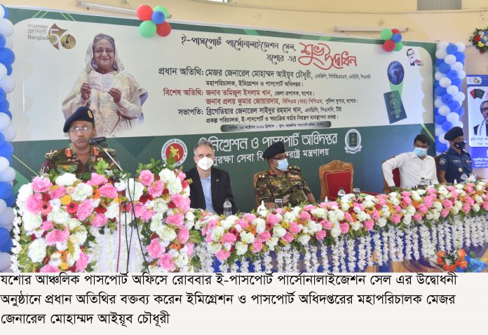উদ্বোধনী অনুষ্ঠানে প্রধান অতিথির বক্তব্যে ইমিগ্রেশন ও পাসপোর্ট অধিদপ্তরের মহাপরিচালক মেজর জেনারেল মোহাম্মদ আইয়ূব চৌধূরী বলেছেন, নতুন করে পাসপোর্ট করতে হলে সঠিত তথ্য দিতে হবে। কর্তৃপরে ভুল না হলে পাসপোর্টের কোন তথ্য সংশোধন করা হবে না। খুলনা বিভাগের ১০ জেলায় ই-পাসপোর্ট সেবা যশোর থেকে সমন্বয় করা হবে। অনলাইনে আবেদন করার পরে ২০ থেকে ২৫ দিনের মধ্যেই ই-পাসপোর্ট পাওয়া যাবে। ই-পাসপোর্টের সকল তথ্য স্থায়ীভাবে নিরাপদে রাখা যাবে। ই-পাসপোর্ট থেকে ৩০ সেকেন্ডের মধ্যে ব্যক্তির সকল তথ্য বের করা সম্ভব হবে। ই-পাসপোর্ট থাকলে বিদেশে কোন দূর্ভোগে পড়তে হবে না। যশোর আঞ্চলিক পাসপোর্ট অফিসে উদ্বোধনী অনুষ্ঠানে সভাপতিত্ব করেন স্বয়ংক্রিয় বর্ডার নিয়ন্ত্রণ ব্যবস্থাপনা প্রকল্পের প্রকল্প পরিচালক ব্রিগেডিয়ার জেনারেল সাইদুর রহমান খান। প্রধান অতিথি মেজর জেনারেল মোহাম্মদ আইয়ূব চৌধূরী আরো বলেন, ই-পাসপোর্টে ফিঙ্গার ও মুখমন্ডলের ছাপ থাকবে। কোন ভাবেই পাসপোর্ট নকল করা যাবে না। তাই ই-পাসপোর্ট আবেদন করার সময় সকল তথ্য যাচাই-বাছাই করে পূরণ করতে হবে। বয়স, নাম, ঠিকানা, জাতীয় পরিচয়পত্র নম্বর, জন্ম নিবন্ধন নম্বর সঠিক ভাবে পূরণ করতে হবে। তিনি আরও বলেন, যশোর পাসপোর্ট অফিসের কোন কর্মকর্তা যদি দূর্নীতির সাথে জড়িত থাকে তাহলে প্রমানসহ তার বিরুদ্ধে অভিযোগ দিলে অবশ্যই প্রয়োজনীয় ব্যবস্থা নেওয়া হবে। স্বাগত বক্তব্য রাখেন উপ প্রকল্প পরিচালক লেফট্যানেন্ট কর্ণেল সৈয়দ নাজমুর রহমান। বক্তব্য রাখেন বিশেষ অতিথি জেলা প্রশাসক তমিজুল ইসলাম খান ও পুলিশ সুপার প্রলয় কুমার জোয়ারদার। জেলা প্রশাসক বলেন, ঢাকার বাইরে প্রথম যশোরে ই-পাসপোর্ট প্রিন্টিং ব্যবস্থা চালু হলো। যা যশোরবাসীর জন্য অত্যান্ত সুখবর। আমার প্রশাসন এ কার্যক্রমে সর্বাত্বক সহযোগীতা করবে। এসময় পুলিশ সুপার বলেন, ই-পাসপোর্ট চালু হলে দেশে জঙ্গিবাদের পাশাপাশি আইন-শৃঙ্খলা নিয়ন্ত্রনে থাকবে। ই-পাসপোর্ট কেউ নকল করতে পারবে না। আরও বক্তব্য রাখেন জার্মানের টেকনিক্যাল প্রজেক্টের পরিচালক পার আলেকজান্ডার কোমারেক, প্রেসকাব যশোরের সভাপতি জাহিদ হাসান টুকুন, যশোর পাসপোর্ট অফিসের উপ পরিচালক মোহাম্মদ নূরুল হুদা। জাহিদ হাসান টুকুন তার বক্তব্যে পাসপোর্ট নিয়ে জনসাধারনের ভোগান্তি উল্লেখ করে বলেন, পাসপোর্ট প্রদানের নির্ধারিত তারিখ পার হলেও মানুষ তাদের পাসপোর্ট হাতে পায়নি। দিনের পর দিন এমনকি মাসের পর মাস তাদের অপেক্ষা করতে হয়েছে। এবার হয়ত মানুষের ভোগান্তির পরিসমাপ্তি হবে। উদ্বোধনী অনুষ্ঠানে মৌসুমী ইসলাম, মেহেরিস ইসলাম, স্বপ্না ও আজিজুর রহমানের ই-পাসপোর্ট বিতরণ করা হয়। পাসপোর্ট অফিস সূত্র জানায়, ২০২০ সালের জুন মাস 