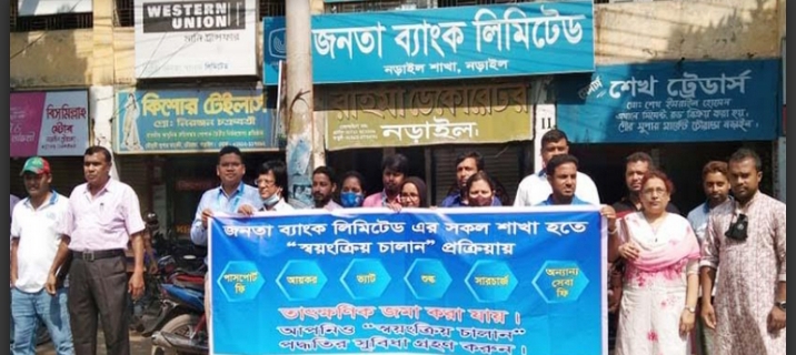 নিজস্ব প্রতিবেদক নড়াইল : জনতা ব্যাংক লিমিটেড এর সকল শাখা হতে “ স্বয়ংক্রিয় চালান” প্রক্রিয়ার উদ্বোধন করা হয়েছে। শনিবার ২৩ অক্টোবর দুপুরে জনতা ব্যাংক লিমিটেড নড়াইল শাখার আয়োজনে একটি শোভাযাত্রা বের হয়। নড়াইল চৌরাস্তা থেকে শোভাযাত্রাটি বের হয়ে শহরের বিভিন্ন সড়ক প্রদনি করে রুপগঞ্জ বাজারে যেয়ে শেষ হয়। এসময় ব্যাংকের প থেকে লিফলেট বিতরণ করা হয়।