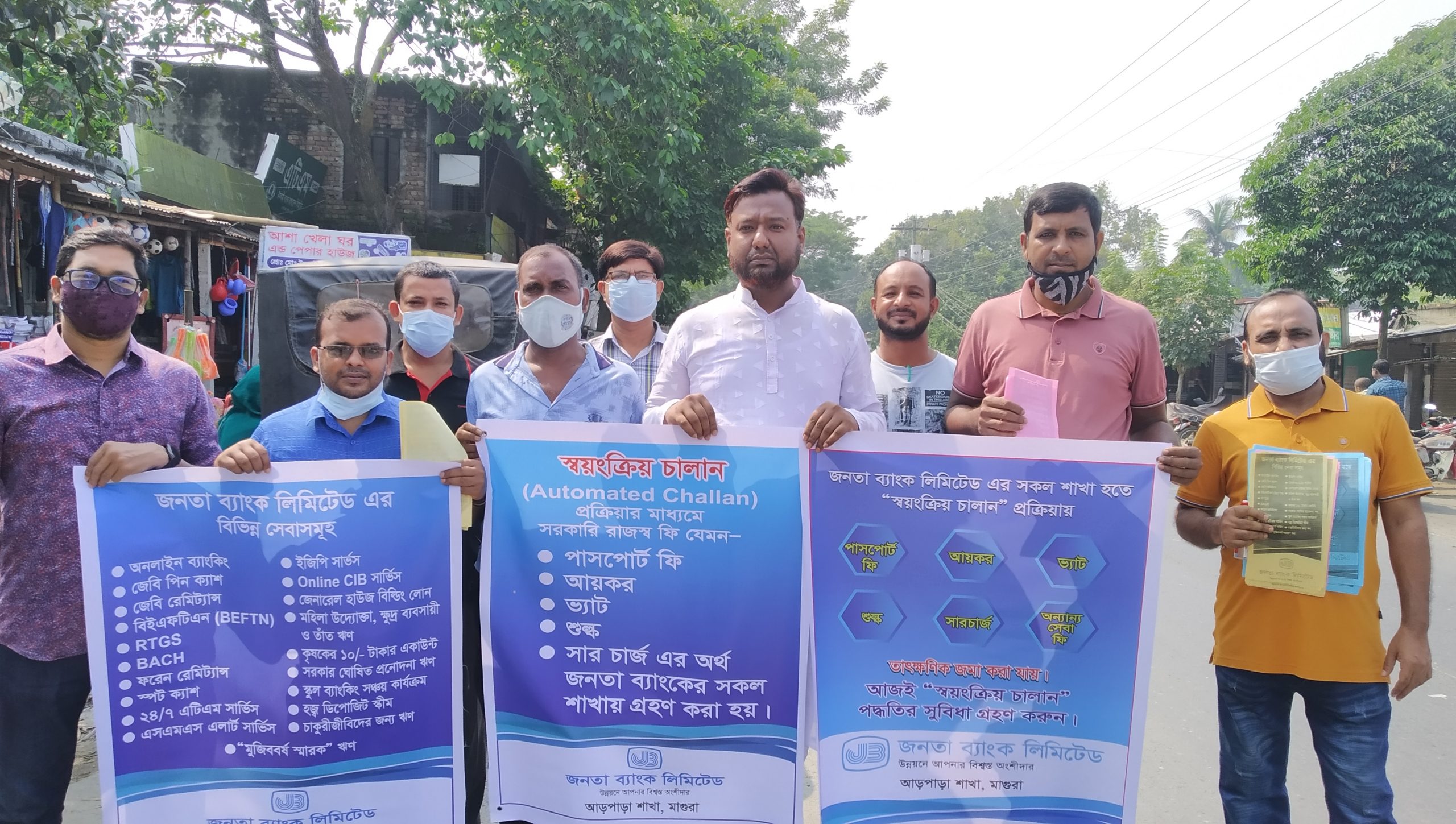 শালিখা (মাগুরা) প্রতিনিধি : মাগুরার শালিখায় জনতা ব্যাংক লিমিটেড আড়পাড়া শাখার উদ্যোগে পাসপোর্ট ফি, আইকর, ভ্যাট, শুল্ক, সারচার্জসহ অন্যান্য সরকারি রাজস্ব সেবা প্রদানে চালান প্রক্রিয়া চালু উপলে লিফলেট বিতরণ ও রোড শো অনুষ্ঠিত হয়েছে। গতকাল শনিবার সকাল ১০ টায় জনতা ব্যাংক আড়পাড়া শাখার ব্যবস্থাপক মওদুদ হোসেনের নেতৃত্বে প্রচারধর্মী এ রোডশো টি জনতা ব্যাংক আড়পাড়া শাখা চত্বর থেকে শুরু করে আড়পাড়া বাজার প্রদণি করে পুনরায় অফিস প্রাঙ্গণে এসে শেষ হয়। এ সময় উপস্থিত ছিলেন জনতা ব্যাংক আড়পাড়া শাখা সিনিয়র অফিসার আয়নাল হক, পলাশ চন্দ্র বিশ্বাস, বিদুষ কুমার বিশ্বাস, যাদব কুমার বিশ্বাস, অফিসার আমিরুল ইসলাম, ইমদাদুল হক সহ অন্যান্য কর্মকর্তা ও কর্মচারীবৃন্দ প্রমুখ। লিফলেট বিতরণকালে জনতা ব্যাংক আড়পাড়া শাখার ব্যবস্থাপক মওদুদ হোসেন বলেন, এখন থেকে জনতা ব্যাংক অন্যান্য ব্যাংকের মতো স্বয়ংক্রিয় চালান প্রক্রিয়া চালু করেছে যার মাধ্যমে গ্রাহকদেরকে প্রদেয় অর্থ তাৎণিকভাবে জমা করা যাবে পাশাপাশি তিনি শালিখার বিভিন্ন শ্রেণী-পেশার মানুষকে কে জনতা ব্যাংকের সেবা গ্রহণের আহ্বান জানান।