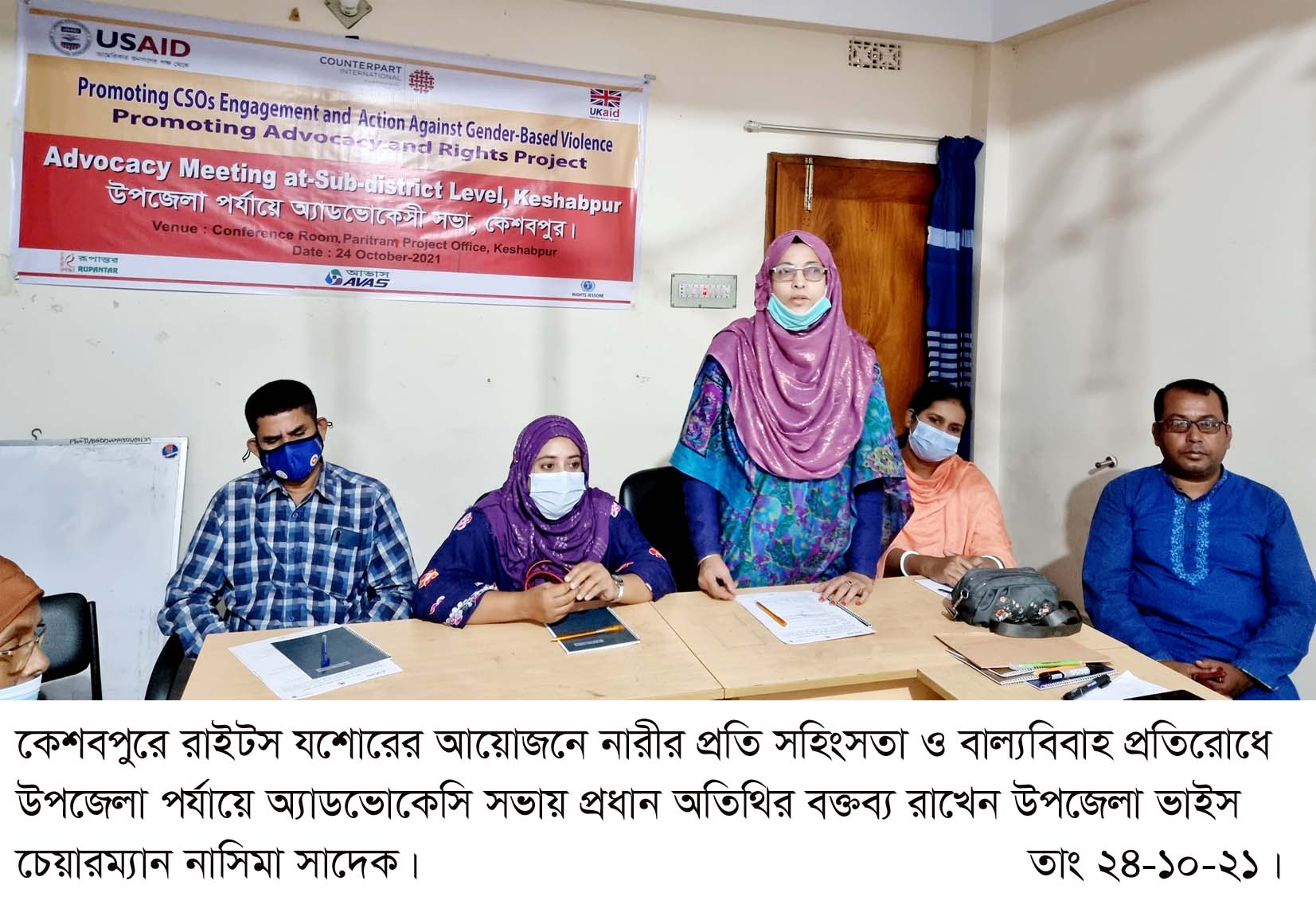 কেশবপুরে রাইটস যশোরের আয়োজনে নারীর প্রতি সহিংসতা প্রতিরোধ, নারী ও মেয়েদের শারীরিক, যৌন, মানসিক এবং অন্যান্য নির্যাতন এবং বৈষম্য থেকে রা ও বাল্যবিবাহ প্রতিরোধে উপজেলা পর্যায়ে এক অ্যাডভোকেসি সভা রবিবার সকালে পরিত্রাণের প্রশিক্ষণ কেন্দ্রে অনুষ্ঠিত হয়েছে। রাইটস যশোরের প্রোগ্রাম ম্যানেজার আজাহারুল ইসলামের সভাপতিত্বে ও রাইটস যশোরের প্রজেক্ট অফিসার প্রণব ধরের পরিচালনায় অনুষ্ঠিত অ্যাডভোকেসি সভায় প্রধান অতিথির বক্তব্য রাখেন উপজেলা ভাইস চেয়ারম্যান নাসিমা সাদেক। বিশেষ অতিথির বক্তব্য রাখেন উপজেলা মহিলা বিষয়ক অফিসার রূপালী রানী, উপজেলা পল্লী উন্নয়ন অফিসার সুলতানা নাসরিন, কেশবপুর উপজেলা প্রেসকাবের সভাপতি এস আর সাঈদ ও সহকারী পল্লী উন্নয়ন অফিসার হংসপতি বিশ্বাস ।
