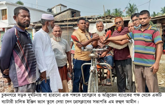 ভ্রাম্যমান প্রতিনিধি,চুকনগর ঃ চুকনগরে এক পঙ্গু অসহায় ব্যক্তিকে বিশেষ প্রক্রিয়ায় (এক পা ওয়ালা ব্যক্তি চালাতে পারে) তৈরি করা একটি ব্যাটারী চালিত ভ্যান উপহার দেয়া হয়েছে। সোমবার দুপুর ১২টায় চুকনগর প্রেসকাব চত্বরে এই ভ্যানটি হস্তান্তর করা হয়। এ সময় উপস্থিত ছিলেন চুকনগর প্রেসকাবের সভাপতি ও চুকনগর অক্সিজেন ব্যাংকের প্রধান সমম্বয়কারী এম রুহুল আমীন, প্রেসকাবের সাধারন সম্পাদক শংকর ঘোষ, সাবেক সাধারন সম্পাদক গৌতম রাহা, চুকনগর অক্সিজেন ব্যাংকের উপ-সমম্বয়কারী প্রভাষক আব্দুর রাজ্জাক, প্রেসকাবের সহ সভাপতি গাজী আব্দুল কুদ্দুস, ব্যবসায়ী শেখ মফিজুল ইসলাম সহ ব্যবসায়ী ও গণ্যমান্য ব্যাক্তিবর্গ। উলেখ্য গত জুলাই মাসে রুহোল আমীন নামের একজন নির্মাণ শ্রমিক সড়ক দূর্ঘটনায় একটি পা হারান। এরপর চুকনগর প্রেসকাবের সভাপতির নিকট এ ধরনের একটি ভ্যান দাবী করেন তিনি। বিষয়টি নিয়ে চুকনগর প্রেসকাবে কর্মরত সাংবাদিকবৃন্দ কয়েকটি জাতীয় ও স্থানীয় পত্রিকায় প্রতিবেদন প্রকাশিত হয় এবং সামাজিক যোগাযোগ মাধ্যমেও প্রচার করা হয়। একপর্যায়ে কয়েকজন প্রবাসী ও স্থানীয় দানশীল ব্যক্তিবর্গের সহায়তা নিয়ে এই ভ্যানটি তৈরি করে দেয়া হয়েছে।