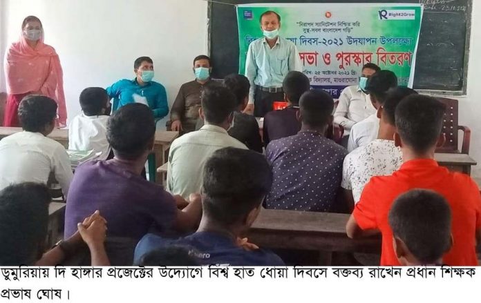 ভ্রাম্যমান প্রতিনিধি,চুকনগর ঃ “নিরাপদ স্যানিটেশন নিশ্চিত করি, সুস্থ-সবল বাংলাদেশ গড়ি” প্রতিপাদ্যটি সামনে রেখে প্রতি বছরের ন্যায় এবছরও সারাদেশে জাতীয় স্যানিটেশন মাস (অক্টোবর) ও বিশ^ হাত ধোয়া দিবস-২০২১ (২৫ই অক্টোবর) পালিত হচ্ছে। তারই ধারাবাহিকতায় ডুমুরিয়া উপজেলার সকল ইউনিয়নে দি হাঙ্গার প্রজেক্ট-বাংলাদেশ ও স্থানীয় জনগোষ্ঠীর সম্পৃক্ততায় দিবসটি উদযাপন করে। প্রতি ইউনিয়নের কিছু সংখ্যক প্রাথমিক ও মাধ্যমিক বিদ্যালয়ের ছাত্র-ছাত্রীদের উপস্থিতিতে হাত ধোয়া প্রদর্শন, কুইজ প্রতিযোগীতা, চিত্রাংকন প্রতিযোগীতা, উপস্থিত বক্তৃতা, নাটক ইত্যাদির আয়োজন করে। পরবর্তীতে স্যানিটেশন ও হাত ধোয়ার উপর গুরুত্বারোপ করে আলোচনা সভা ও পুরস্কার বিতরণী অনুষ্ঠানের আয়োজন করা হয়। আলোচনা সভায় শিকবৃন্দ, এলাকার গুনীজন, দি হাঙ্গার প্রজেক্ট-বাংলাদেশ এর রাইট-টু-গ্রো প্রকল্পের সংশ্লিষ্ট ইউনিয়নের ইউনিয়ন সমন্বয়কারী এবং কমিউনিটি প্রমোটরদ্বয়, ছাত্র-ছাত্রীবৃন্দসহ অনেকে স্যানিটেশন ও হাত ধোয়ার প্রয়োজনীয়তা ও গুরুত্ব সর্ম্পকে মূল্যবান আলোচনা করেন। আলোচনা শেষে বিশ^ হাত ধোয়া দিবস-২০২১ উপল্েয আয়োজিত বিভিন্ন প্রতিযোগীতার বিজয়ীদের মধ্যে উপস্থিত শিক মন্ডলী ও অতিথিবৃন্দ পুরস্কার তুলে দেন।