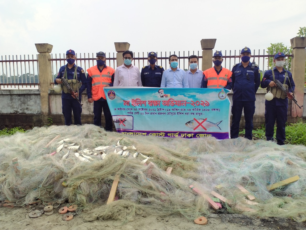 ইলিশের প্রজনন মৌসুমকে ঘিরে মা ইলিশ সংরক্ষণে উপকূল জুড়ে অভিযান চালায় কোস্ট গার্ড। গত ৪ অক্টোবর থেকে ২৫ অক্টোবর মধ্যরাত পর্যন্ত ২২ দিনে কোস্ট গার্ড উপকূলীয় অঞ্চলের বিভিন্ন নদীতে ৩ হাজার ৪৯ টি অভিযান পরিচালনা করেন। ওই সকল অভিযানে ২শ ৩৩ কোটি ৬৪ লাখ ১৬ হাজার টাকা মূল্যের ৬ কোটি ৩৭ লাখ ৯৮ হাজার মিটার বিভিন্ন ধরণের অবৈধ জাল, ৯ হাজার ৮শ ৩২ কেজি ইলিশ মাছ, ১শ ১৫ টি বোট ও ২শ ৫৭ জন জেলেকে আটক করা হয়। জব্দকৃত ওইসব অবৈধ জাল স্থানীয় প্রসাশন, আইন প্রয়োগকারী সংস্থা ও সংশ্লিষ্ট মৎস্য কর্মকর্তাদের উপস্থিতিতে আগুনে পুড়িয়ে ধ্বংস এবং মাছগুলো স্থানীয় এতিমখানাসহ গরীব দুঃস্থদের মাঝে বিতরণ করা হয়। এছাড়া আটককৃত জেলেদের ভ্রাম্যমাণ আদালতের মাধ্যমে বিভিন্ন মেয়াদে সাজা ও অর্থদন্ড দেয়া হয়। এ সব তথ্য জানিয়েছেন বাংলাদেশ কোস্ট গার্ড সদর দপ্তরের (ঢাকা) মিডিয়া কর্মকর্তা লেঃ খন্দকার মুনিফ তকি।