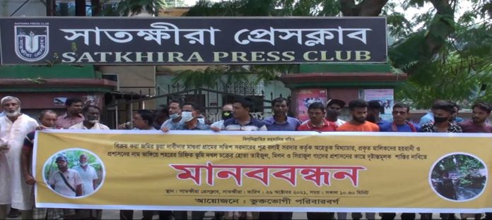 সাতক্ষীরা প্রতিনিধি ঃ সাতক্ষীরা শহরের চিহ্নিত ভুমিদখল চক্রের হোতা অবসর প্রাপ্ত পুলিশ সদস্য তাইজুল ইসলাম, কথিত সাংবাদিক সিরাজুল ইসলাম (জামাই সিরাজ) ও মিলনের বিরুদ্ধে আইনগত ব্যবস্থা গ্রহনের দাবীতে মানববন্ধন করেছেন ভূক্তভোগী এলাকাবাসী। ভুক্তভোগী এলাকা বাসীর আয়োজনে মঙ্গলবার বেলা ১১টায় সাতক্ষীরা প্রেসকাবের সামনে উক্ত মানববন্ধন কর্মসুচি পালিত হয়।