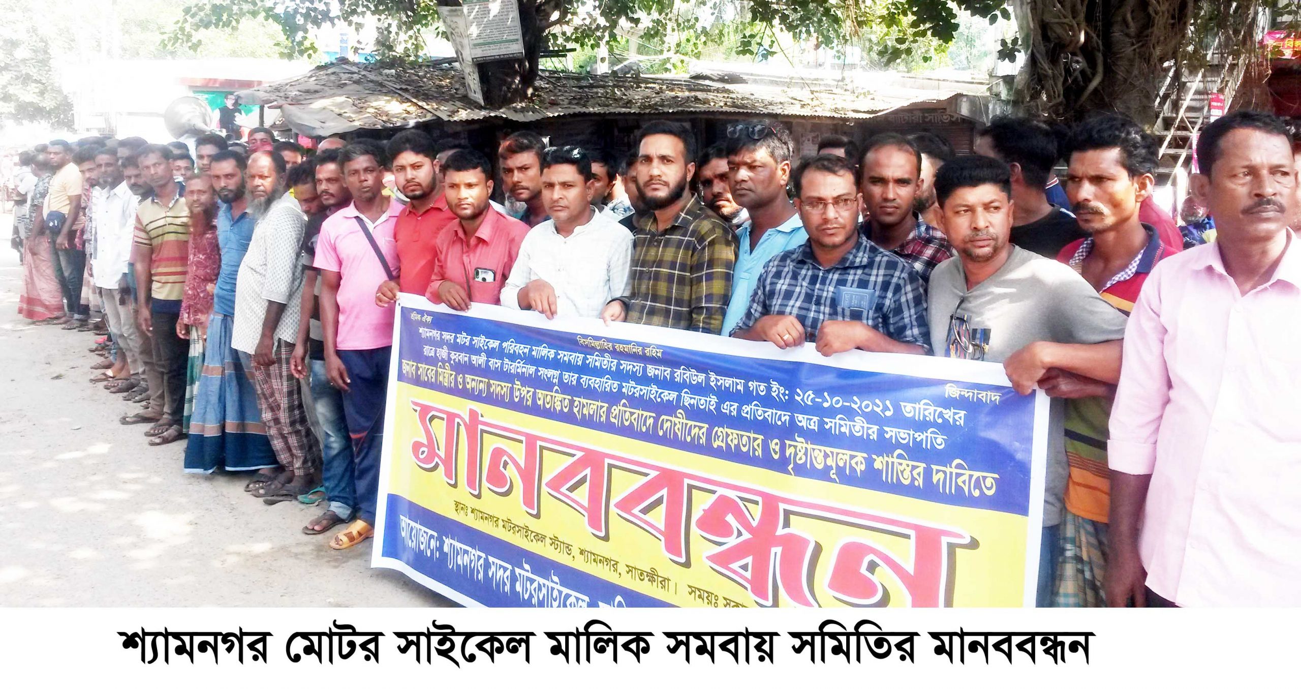 সামিউল মন্টি ঃ শ্যামনগর উপজেলা সদরের মোটর সাইকেল মালিক সমবায় সমিতির সদস্য রবিউল ইসলামের মোটর সাইকেল ছিনতাই ও মারপিঠ করার প্রতিবাদে সমিতির আয়োজনে সকাল ১০ টায় মানববন্ধন অনুষ্ঠিত হয়। শ্যামনগর সদর সমিতির সকল সদস্য ও ১২ টি ইউনিয়নের সভাপতি সম্পাদক মানববন্ধনে অংশগ্রহন করে। শ্যামনগর সদর মোড়ে প্রধান সড়কের উপর মানববন্ধন শেষে প্রেসকাবের সামনে মানববন্ধন চলাকালে সদরের সাবেক সভাপতি আব্দুস সোবহান, সাধারন সম্পাদক মোঃ হেলাল উদ্দীন ও বিভিন্ন ইউনিয়ন কমিটির সভাপতি, সম্পাদক বক্তব্য রাখেন। বক্তাগণ বলেন, কলোনী পাড়ার সন্ত্রাসী বাহিনী মোটর সাইকেল সমিতির সদস্য মোঃ রবিউল ইসলামের গতি রোধ করে তার মোটর সাইকেল ছিনতাই করে ও মারপিঠ করে। এসময় বর্তমান সভাপতি সাবের ঠেকাতে গেলে তাকেও মারপিঠ করে। এদুইজন গুরুতর আহত হয়ে শ্যামনগর হাসপাতালে চিকিৎসাধীন। শ্যামনগর থানায় রবিউল ইসলাম বাদী হয়ে লিয়াকত আলী, আব্দুল হামিদ ও জিন্নাহ সহ ১০ জনের বিরুদ্ধে ইং ২৬/১০/২০২১ তারিখ ৩৮ নং মামলা হয়েছে। বক্তাগণ প্রশাসনের নিকট সকল আসামীদের গ্রেপ্তারের দাবি জানান ।