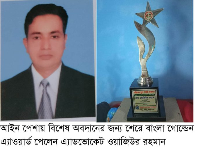 বিশেষ প্রতিনিধি : আইন পেশায় বিশেষ অবদানের জন্য কেশবপুরের কৃতি সন্তান ওয়াজিউর রহমান পেলেন শেরে-বাংলা গোল্ডেন এ্যাওয়ার্ড-২০২১। সাউথ এশিয়া সোস্যাল এডুকেশন ফাউন্ডেশনের উদ্যোগে গত ১৯ নভেম্বর শুক্রবার সন্ধ্যায় ঢাকার বিজয়নগরের একটি হোটেলে স্বাধীনতার সুবর্ণ জয়ন্তী উদ্যাপন উপলে এই অনুষ্ঠানের আয়োজন করা হয়। সংগঠনের প থেকে তাকে এ সম্মাননা দেয়া হয়। তিনি যশোর জেলা জজকোর্টের আইনজীবী। অ্যাওয়ার্ড প্রদানের পূর্বে আলোচনা সভা ও মনোজ্ঞ সাংস্কৃতিক অনুষ্ঠান অনুষ্ঠিত হয়। অনুষ্ঠানে সাউথ এশিয়া সোস্যাল এডুকেশন ফাউন্ডেশনের মহাসচিব মোঃ আর. কে. রিপনের পরিচালনায় প্রধান আলোচক ছিলেন শেরে-বাংলা কৃষি বিশ্ববিদ্যালয়ের উপাচার্য অধ্যাপক ড. শহীদুর রশীদ ভূঁইয়া, সাবেক তথ্য সচিব ও সংগঠনের উপদেষ্টা সৈয়দ মার্গুব মোর্শেদ প্রমুখ। এছাড়া বিভিন্ন সামাজিক, সাংস্কৃতিক ও রাজনৈতিক ব্যক্তিবর্গসহ অনেকেই উপস্থিত ছিলেন। উল্লেখ্য যে, এ্যাডভোকেট ওয়াজিউর রহমান কেশবপুর উপজেলার লক্ষ্মীনাথকাটি গ্রামের বাবা খোশদেল মোড়ল ও মাতা আছিয়া বেগমের সুযোগ্য পুত্র।