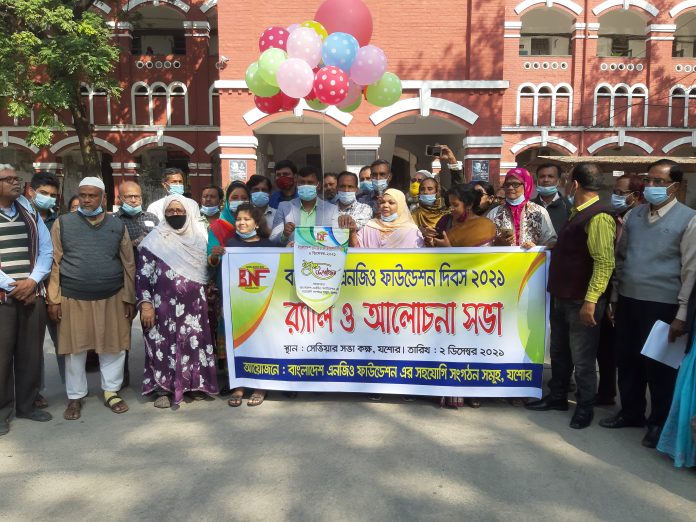 প্রেস বিজ্ঞপ্তি ঃ গণপ্রজাতন্ত্রী বাংলাদেশ সরকার ২০০৪ সালের ২ ডিসেম্বর বাংলাদেশ এনজিও ফাউন্ডেশন প্রতিষ্ঠা করে। একটি স্ব-শাসিত প্রতিষ্ঠান হিসেবে দারিদ্র্য বিমোচন ও সামাজিক উন্নয়নের ল্েয সহযোগী এনজিওদের মাধ্যমে প্রতিষ্ঠালগ্ন থেকে অনগ্রসর জনগোষ্ঠীর সামর্থ্য উন্নয়ন বিশেষ করে নারী, সংখ্যালঘু ও আদিবাসী জনগোষ্ঠীসহ বিভিন্ন পর্যায়ে প্রান্তিক ও অসহায় জনগোষ্ঠীকে সেবা সহায়তা কাঠামোর ভিত্তি সুদৃঢ় করে উন্নয়নের মূল স্রোতে নিয়ে আসার জন্য বিভিন্ন কর্মসূচি বাস্তবায়ন করছে। ইতোমধ্যে “সহস্রাব্দ উন্নয়ন লক্ষ্য (এমডিজি)” অর্জনের পাশাপাশি গণপ্রজাতন্ত্রী বাংলাদেশ সরকারের “রূপকল্প-২০২১” বাস্তবায়িত করার লক্ষ্যে ুধা ও দারিদ্র্যমুক্ত সমৃদ্ধ বাংলাদেশ গঠনে এ ফাউন্ডেশনের নিরলস প্রচেষ্টা অব্যাহত রয়েছে। সহযোগী সংস্থাকে অনুদান প্রদানের মাধ্যমে দেশের দরিদ্র এবং অতি দরিদ্র জনগণের জীবনযাত্রার মানোন্নয়নে ৩০টি কর্মসূচিতে বাংলাদেশ এনজিও ফাউন্ডেশন জুন ২০২১ পর্যন্ত ১১২০টি সহযোগী সংস্থার মধ্যে বিশেষ কর্মসূচিসহ সর্বমোট ১৫৯.১০ কোটি টাকা (সরকারের নিকট হতে গত দুই অর্থবছরে বিশেষ অনুদান হিসেবে প্রাপ্ত ১০ কোটি টাকার মধ্যে ২০১৯-২০২০ অর্থবছরের ৫ কোটি ও ২০২০-২০২১ অর্থবছরে ৪.৮২ কোটি টাকা উক্ত ব্যয়ের মধ্যে অন্তর্ভূক্ত) অনুদান প্রদান করা হয়েছে। যাহার উপকারভোগী (প্রত্যক্ষ ও পরোক্ষ) মোট সংখ্যা ৯৯.১২ ল জন (মহিলা ৬১.৬২ ল জন এবং পুরুষ ৩৭.৫০ ল জন)। এরই ধারাবাহিকতায় বাংলাদেশ এনজিও ফাউন্ডেশন দিবস ২০২১ উদযাপন উপলক্ষে যশোর জেলার সহযোগি সংস্থা সমুহ ২ ডিসেম্বর র্যালি ও আলোচনা সভার আয়োজন করে। সকাল ১০.৩০ ঘটিকায় কালেক্টরেট চত্তরে র্যালি উদ্ভোধন করেন মোঃ রফিকুল হাসান, অতিরিক্ত জেলা প্রশাসক সার্বিক। র্যালি শেষে সেভিয়ার কার্যালয়ে আলোচনা সভা অনুষ্ঠিত হয় উক্ত আলোচনা সভায় সভাপতিত্ব করেন মোঃ আব্দুস সাত্তার, পরিচালক, সার্ক সংস্থা, অলোচনা সভায় আরও বক্তব্য প্রদান করেন মনিরুজ্জামান মনির, জেডিও, সৈয়দ সিরাজুল হক, রুডো, কানন চক্রবর্তী, প্রেরণা, বাবুর আলী গোলদার, পিএসকেএস, জামিউল ইসলাম, পিজেএস, মনিরা বেগম, ডিআরও।