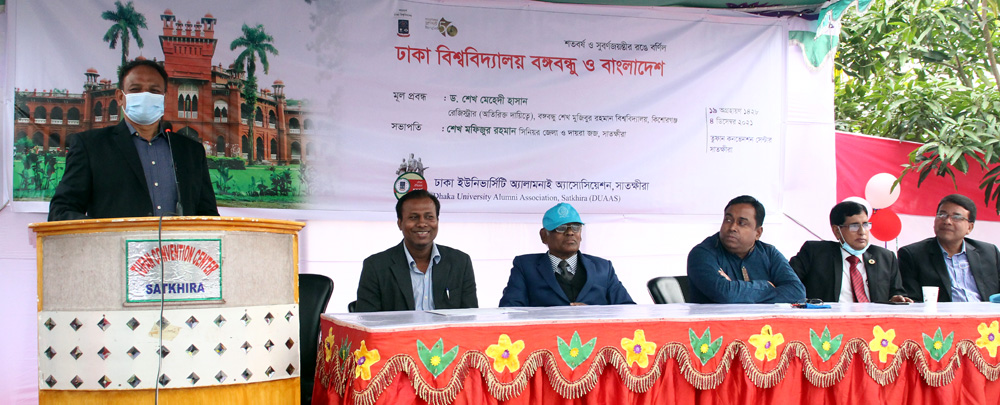 সাতক্ষীরা প্রতিনিধি ঃ ঢাকা বিশ্ববিদ্যালয়ের শততম বর্ষ পূর্তি উপলক্ষে সাতক্ষীরায় ঢাকা বিশ্ববিদ্যালয় বঙ্গবন্ধু ও বাংলাদেশ শীর্ষক আলোচনা সভা অনুষ্ঠিত হয়েছে। “শতবর্ষে ও সুবর্ণজয়ন্তীর রঙে বর্ণিল” শ্লোগানে অনুষ্ঠিত আলোচনা সভায় সভাপতিত্ব করেন, সাতক্ষীরা সিনিয়র জেলা ও দায়রা জজ শেখ মফিজুর রহমান। ঢাকা ইউনিভার্সিটি অ্যালামনাই অ্যাসোসিয়েশন সাতক্ষীরার আয়োজনে আলোচনাসভায় বক্তব্য রাখেন, সাতক্ষীরা পুলিশ সুপার মোহাম্মদ মোস্তাফিজুর রহমান, জাতীয় নিরাপত্তা গোয়েন্দা খুলনা বিভাগীয় উপ-পরিচালক জামান উদ্দিন, সাতক্ষীরা সরকারি কলেজের অধ্যক্ষ এম.আফজালুর রহমান, কলারোয়া সরকারি কলেজের অধ্যক্ষ আনোয়ারুজ্জামান, ঢাকা ইউনিভার্সিটি অ্যালামনাই অ্যাসোসিয়েশন সাতক্ষীরার সভাপতি প্রফেসর আব্দুল হামিদ, রেডিও তেহরান এর সংবাদ পাঠক জি এম আব্দুর রশিদ প্রমুখ। অনুষ্ঠানে মূল প্রবন্ধ উপস্থাপন করেন, বঙ্গবন্ধু শেখ মুজিবুর রহমান বিশ্ববিদ্যালয় কিশোরগঞ্জের রেজিষ্ট্রার (অতিরিক্ত দায়িত্বে) ড. মেহেদী হাসান। সমগ্র অনুষ্ঠান পরিচালনা করেন, ঢাকা ইউনিভার্সিটি অ্যালামনাই অ্যাসোসিয়েশন সাতক্ষীরার সাধারণ সম্পাদক হাফিজুর রহমান মাসুম। আলোচনাসভায় বক্তারা বলেন, বাংলাদেশের স্বাধীনতা যুদ্ধসহ সকল আন্দোলন সংগ্রামে ঢাকা বিশ্ববিদ্যালয়ের একটি গুরুত্বপূর্ণ অবদান রয়েছে। নবাব আব্দুল লতিফ, স্যার সলিমুল্যাহসহ অনেকেই ঢাকা বিশ্ববিদ্যালয়কে প্রতিষ্ঠায় ভূমিকা রেখেছিলেন। বঙ্গবন্ধু কে বাদ দিয়ে যেমন বাংলাদেশকে ভাবা যায়না। তেমনি ঢাকা বিশ্ববিদ্যালয়ও বাংলাদেশের ইতিহাস, ঐতিহ্য সংগ্রামের সাথে জড়িত। সকল অর্জনের ঢাকা বিশ্ববিদ্যালয়ের ভূমিকা রয়েছে। ঢাকা বিশ্ববিদ্যালয় হাজার হাজার বছর ধরে জ্ঞানের আলো ছড়াবে এই প্রত্যাশা সকলের। আলোচনা সভা শেষে ঢাকা বিশ্ববিদ্যালয়ের সাবেক শিক্ষার্থীদের স্মৃতিচারণে সকলেই হারিয়ে যান সেই শিক্ষাজীবনে। পুরো অনুষ্ঠান স্থল পরিণত হয় মিলন মেলায়।