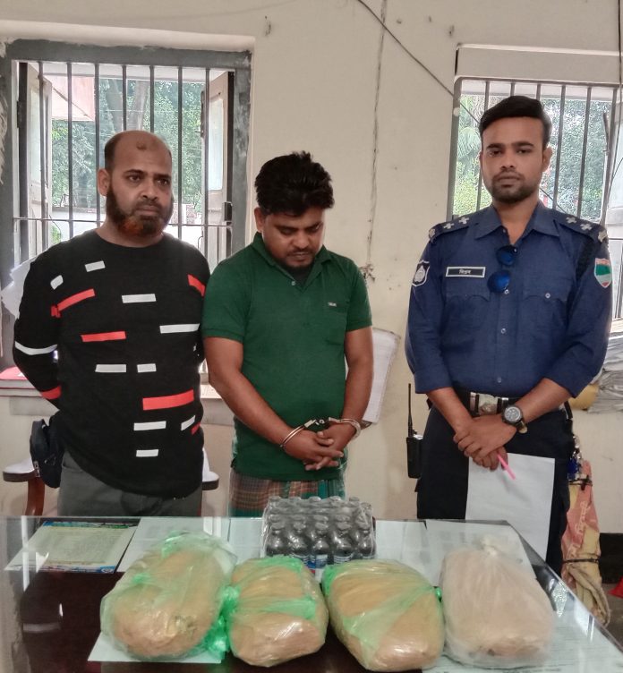 চৌগাছা পৌর প্রতিনিধি ঃ যশোরের চৌগাছায় মাদকসহ রবিউল ইসলাম (৬৪) নামে এক মাদক ব্যবসায়ীকে গ্রেপ্তার করেছে থানা পুলিশ। মঙ্গলবার (৭ডিসেম্বর) উপজেলার খড়িঞ্চা বাজার থেকে ভোর ৬.৪৫ মিনিটে তাকে গ্রেপ্তার করা হয়। এসময় আসামির সাথে থাকা এক সহযোগী যশোর ফুলবাড়ির জোহর আলী মণ্ডলের ছেলে সিরাজুল ইসলাম (৪০) পালিয়ে যেতে সম হয়। গ্রেপ্তারকৃত রবিউল ইসলাম যশোর জেলার কোতোয়ালি থানার ওসমানপুর গ্রামের মোমিন আলী বিশ্বাসের ছেলে। এসময় আসামীর নিকট হতে ২৫ বোতল ফেন্সিডিল ও ৪ কেজি গাঁজা উদ্ধার করা হয়। চৌগাছা থানার এ এস আই মোঃ কামালের নেতৃত্বে এস আই বিপ্লব, কনস্টেবল শাহজাহান সঙ্গীয় ফোর্সসহ অভিযান চালিয়ে আসামীকে গ্রেপ্তার করা হয়। এএসআই মোঃ কামাল বলেন, মঙ্গলবার ভোর ৬.৪৫ মিনিটে গোপন সংবাদের ভিত্তিতে খড়িঞ্চা বাজারে অবস্থানরত পুড়াপাড়া বাজার থেকে যশোরের উদ্দেশ্যে রওনা হওয়া আসামী রবিউল ইসলামকে মাদকসহ হাতেনাতে গ্রেপ্তার করি। এবং আসামীর এক সহযোগী সিরাজুল ইসলাম দৌড়ে পালাতে সম হয়। তিনি আরো বলেন, মামলার কার্যক্রম প্রক্রিয়াধীন, সুতরাং মামলা হবে।