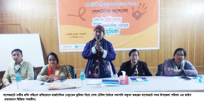বাগেরহাট প্রতিনিধি : বাগেরহাটে নারীর প্রতি সহিংসা প্রতিরোধে রাজণৈতিক নেত্বতের ভুমিকা নিয়ে গোল টেবিল বৈঠক অনুষ্ঠিত হয়েছে।সোমবার সকালে বাগেরহাটের একটি অভিযাত হোটেলে ডেমোক্রেসী ইন্টার ন্যাশন্যাল এর উদ্যোগে বিভিন্ন রাজনৈতিক ব্যক্তিত্ব,নারী নেত্রী,পেশাজীবী ও সামাজিক প্রতিষ্ঠানের প্রতিনিধি এবং সাংবাদিকদের নিয়ে এই গোল টেবিল বৈঠক অনুষ্ঠিত হয়।বাগেরহাট জেলা আহবায়ক ও সদর উপজেলা পরিষদ এর ভাইস চেয়ারম্যান রিজিয়া পারভীন এর সভাপতিত্বে ও ডেমোক্রেসী ইন্টার ন্যাশন্যাল এর রিজিওনাল প্রোগ্রাম অফিসার মো: রুবাইয়াত হাসান এর সঞ্চালনায় উক্ত বৈঠকে বক্তৃতা করেন,বাগেরহাট জেলা বিএনপির সদস্য সচীব মোজাফ্ফর রহমান আলম,জেলা মহিলা লীগের সাধারন সম্পাদিকা এ্যাড: শরিফা হেমায়েত,জেলা মহিলা দলের সাধারন সম্পাদিকা মিসেস সাহিদা আক্তার,সদর উপজেলা আওয়ামীলীগের সভাপতি শেখ আক্তারুজ্জামান বাচ্চু,বাগেরহাট প্রেস কাবের সাবেক সহসভাপতি মোল্লা আব্দুর রব জেলা মহিলা বিষয়ক প্রোগ্রাম অফিসার সুবিতা ইয়াসমিন, জেলা বিএনপি নেতা মেহেবুবুল হক কিশোর,নারীনেত্রী মিসেস মোরশেদা বেগম,নাজমুন নাহার,মিসেস ইভা আক্তার,মিসেস সালমা বেগম,অঞ্জলী দাস,পারভীন আক্তার,সমাপ্তি ডাকুয়া,মিসেস তাছলিমা বেগম,মিসেস ফারজানা আক্তার প্রমুখ।সভায় নারীদেও কর্মসংস্থানের সুযোগ সৃষ্টি কওে দেওয়াসহ জেলার প্রত্যন্ত অঞ্চলে নারী ও শিশুদের প্রতি নির্যাতন বন্দে ডেমোক্রেসী ইন্টার ন্যাশন্যাল এর পক্ষ থেকে বিভিন্ন সিন্ধান্ত গ্রহন করা হয়।