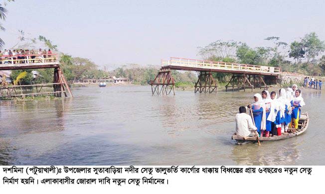 উপজেলা এলজিইডি সূত্রে জানা যায়, নতুন সেতু নির্মাণে নদীর দুই পাড়ে মাটি পরীা-নিরীায় শক্ত লেয়ার না পাওয়ায় ঐ স্থানে নির্মাণ কাজ বাতিল করে দিয়েছে জাইকা। তাই নতুন সেতু কবে নির্মাণ করা হবে তা কেউ জানে না। ফলে যাতায়াতে চরম দুর্ভোগ পোহাতে হচ্ছে দুই পাড়ের মানুষের। ঝুঁকি নিয়ে বৃদ্ধ ও শিশুরা নৌকায় করে সুতাবাড়িয়া নদী পারাপার হচ্ছে। জানা গেছে, খারিজা বেতাগী হাট সংলগ্ন জমিন মৃধা বাজারের সেতুটি দিয়ে উপজেলা সদর, খারিজমা বাজার, বড় গোপালদী বাজার, ঠাকুরের হাট বাজার, সানকিপুর বাজার, বেতাগী মাধ্যমিক বিদ্যালয়, বড় গোপালদী দাখিল মাদ্রাসাসহ তিনটি সরকারি প্রাথমিক বিদ্যালয়ে প্রতিদিন কয়েক শ’ ছাত্র-ছাত্রী ও কয়েক হাজার মানুষ যাতায়াত করত। সেতুটি ভেঙে পড়ার পর থেকে স্থানীয় বাসিন্দারা একটি ছোট ডিঙি নৌকায় জীবনের ঝুঁকি নিয়ে সুতাবাড়িয়া নদী পারাপার হচ্ছে। করোনাকালে বিদ্যালয় বন্ধ থাকলেও অ্যাসাইনমেন্ট ও পড়াশোনা চালিয়ে নেওয়ার জন্য নদী পার হতে হয় শত শত শিার্থীকে।