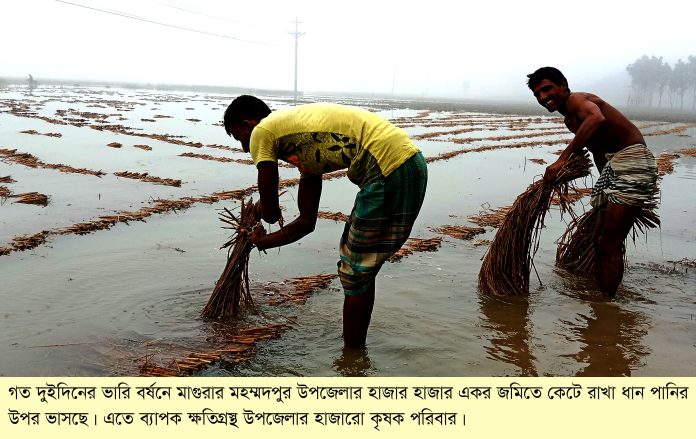 মহম্মদপুর (মাগুরা) প্রতিনিধি : পানির উপর ভাসছে মাগুরার মহম্মদপুর উপজেলার হাজারো কৃষকের স্বপ্ন। আবহাওয়া অনুকুলে থাকায় এ বছর আমন ধানের বাম্পার ফলনের সম্ভাবনা ছিল। কিন্তু ঘুর্ণিঝড় জাওয়াদের প্রভাবে গত দুই দিনের বৃষ্টিতে ফসলি মাঠ তলিয়ে গেছে। এতে উপজেলার প্রতিটি মাঠে হাজার হাজার একর জমিতে কেটে রাখা ধান ভাসছে পানির উপরে। এছাড়াও ক্ষেতে পানি জমে থাকায় মৌসুমী ফসল ও শাক-সবজি চাষিদের ব্যাপক হয়েছে। চরম দুশ্চিন্তায় পড়েছে ক্ষতিগ্রস্থ এই কৃষক পরিবারগুলো। দুইদিনের বৃষ্টিতে উপজেলার আটটি ইউনিয়নের মাঠে মাঠে কৃষকদের কষ্ঠার্জিত পাকা, আধাপাকা ধান ও শাক-সবজি নষ্ট হয়ে গেছে। এতে মাথায় হাত পড়েছে কৃষকদের। অনেকেই চিন্তায় চিন্তায় দিশেহারা হয়ে পড়ছেন। আবার কেউ কেউ সারা বছর কি খাবে এ নিয়েও রয়েছেন দুশ্চিন্তায়। ধোয়াইল গ্রামের কৃষক জামাল হোসেন বলেন, আমার প্রায় একর জমির ধান ও মুসুরি পানিতে তলিয়ে গেছে। সারা বছরের খাবার নষ্ট হয়ে গেলো। এখন আমাদের কি হবে জানিনা। আমার মতো অনেকেরই খুব ক্ষতি হয়ে গেলো। উপজেলার বিভিন্ন এলাকার এ রকম অনেক কৃষক তাদের কষ্টের কথা বলতে যেয়ে কান্নায় ভেঙ্গে পড়েন। উপজেলা কৃষি অফিসার মোঃ আব্দুস সোবাহান জানান, চলতি মৌসুমে উপজেলায় ১২ হাজার ২শ ২০ হেক্টর জমিতে আমন ধানের চাষ হয়েছিল। আবহাওয়া অনুকুলে থাকায় ধানের বাম্পার ফলনের সম্ভাবনা ছিল। তবে বেশির ভাগ জমির ধান কৃষকদের ঘরের তোলা হয়ে গেছে। যাদের হয়নি সেই সব কৃষক ব্যাপক ক্ষতিগ্রস্থ হয়েছে।