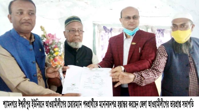শ্যামনগর ব্যুরো ঃ ঈশ্বরীপুর ইউনিয়ন আওয়ামীলীগের আয়োজনে মাননীয় প্রধানমন্ত্রী কর্তৃক নৌকা প্রতীকের মনোনয়ন পত্র হস্তান্তর ও ঈশ্বরীপুর ইউনিয়ন আওয়ামীলীগের এক বর্ধিত সভা অনুষ্ঠিত হয়। গতকাল ৮ ডিসেম্বর সকাল ১০ টায় ইউনিয়ন পরিষদ চত্ত্বরে এ অনুষ্ঠানে ঈশ্বরীপুর ইউনিয়ন আওয়ামীলীগের সভাপতি এ্যাড. জিএম শোকর আলীর সভাপতিত্বে প্রধান অতিথির বক্তব্য রাখেন সাতক্ষীরা জেলা আওয়ামীলীগের ভারপ্রাপ্ত সভাপতি সাবেক এমপি আলহাজ্ব এ.কে ফজলুল হক। বিশেষ অতিথির বক্তব্য রাখেন- উপজেলা আওয়ামীলীগের সাধারন সম্পাদক উপজেলা পরিষদ চেয়ারম্যান এসএম আতাউল হক দোলন। আরও বক্তব্য রাখেন ইউনিয়ণ আওয়ামীলীগের সাধারন সম্পাদক বজলুল রশিদ, সাংগঠনিক সম্পাদক গাজী গোলাম মোস্তফা, সিনিয়র সহ-সভাপতি জিএম মনসুর আলম, ওয়ার্ড সভাপতি জি,এম মোহাম্মাদ আলী, সাধারন সম্পাদক ডাঃ আব্দুর সবুর সহ আরও অনেকে। অনুষ্ঠানে ইউনিয়ণ আওয়ামীলীগের সকল নেতাকর্মী ও সুধীজন উপস্থিত ছিলেন। বক্তব্য পর্বের পর প্রধান অতিথি এ.কে ফজলুল হক মাননীয় প্রধানমন্ত্রী কর্তৃক নৌকা প্রতীকের মনোনয়ন পত্র (ইউপি চেয়ারম্যান পদপ্রার্থী) এ্যাড. শোকর আলীর হাতে হস্তান্তর করেন।