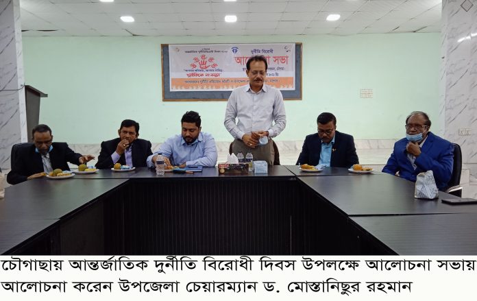 চৌগাছা (যশোর) প্রতিনিধি ॥ যশোরের চৌগাছায় আন্তর্জাতিক দুর্নীতি বিরোধী দিবস উপলক্ষে বৃহস্পতিবার সকালে আলোচনা সভা ও মানববন্ধন অনুষ্ঠিত হয়েছে। উপজেলা পরিষদ মিলনায়তনে দুর্নীতি প্রতিরোধ কমিটির উদ্যোগে আলোচনা সভায় সভাপতিত্ব করেন ভারপ্রাপ্ত নির্বাহী অফিসার ও সহকারী কমিশনার ভূমি কাফি বিন কবীর। সভায় আলোচনা করেন উপজেলা চেয়ারম্যান অধ্যক্ষ ড. এম মোস্তানিছুর রহমান। অন্যান্যের মধ্যে আলোচনা করেন উপজেলা ভাইস চেয়ারম্যান দেবাশিষ মিশ্র জয়, উপজেলা মাধ্যমিক শিক্ষা কর্মকর্তা আবুল কালাম রফিকুজ্জামান, উপজেলা দুর্নীতি প্রতিরোধ কমিটির সভাপতি সহকারী অধ্যাপক মোঃ কামরুজ্জামান, সাধারণ সম্পাদক তমিজ উদ্দীন, সহ-সভাপতি ডাঃ গোলাম মোস্তফা, তথ্য সৈনিক আশারফ হোসেন আশা, দুর্নীতি প্রতিরোধ কমিটির চৌগাছা ইউনিয়নের সভাপতি এ বি সিদ্দিক প্রমূখ। সভায় দুর্নীতি প্রতিরোধে সকলকে সোচ্চার হবার আহবান জানানো হয়। এ সময় বীর মুক্তিযোদ্ধা আব্দুল বাতেন ও মোঃ মোবাশ্বের, প্রেসকাব চৌগাছার সাধারণ সম্পাদক শাহানুর আলম উজ্জ্বল, দুর্নীতি প্রতিরোধ কমিটির সদস্য আসাদুজ্জামান মুক্ত, আব্দুল আল বাকি, সাফিয়া সুলতানা সেঁজুতি নূর প্রমূখ উপস্থিত ছিলেন। আলোচনা সভার আগে উপজেলা পরিষদ চত্তরে এক মানববন্ধন অনুষ্ঠিত হয়।
