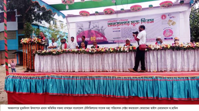নওয়াপাড়া অফিস : গতকাল ছিলো যশোরের অভয়নগর মুক্ত দিবস। বন্যাঢ্য আয়োজনের দিবসটি উদযাপিত হয়েছে। আলোকিত করা হয়েছে শিল্প বাণিজ্য ও বন্দর নগরী নওয়াপাড়া। এ উপলক্ষে গতকাল নওয়াপাড়া ইনষ্টিটিউট মাঠে সকাল ১০ টায় মুক্তদিবস উদযাপন কমিটির উদ্যোগে আলোচনা সভা অনুষ্ঠিত হয়। এ সময় কমিটির সভাপতি অভয়নগর উপজেলা আওয়ামীলীগের সভাপতি এনামুল হক বাবুলের সভাপতিত্বে মুক্তিযোদ্ধাদের সংবর্ধনা দেয়া হয়। সংবর্ধনা অনুষ্ঠানে প্রধান অতিথি হিসাবে বক্তব্য রাখেন বাংলাদেশ টেলিভিশনের সাবেক মহাপরিচালক, সেক্টর কমান্ডারস ফোরামের ভাইস চেয়ারম্যান, মিডিয়া ব্যক্তিত্ব বীর মুক্তিযোদ্ধা ম,হামিদ। বিশেষ অতিথি হিসাবে বক্তব্য রাখেন নওয়াপাড়া কলেজের অধ্যক্ষ রবিউল হাসান, অভয়নগর উপজেলা মুক্তিযোদ্ধা কমান্ডের আহবায়ক বীর মুক্তিযোদ্ধা আলী আহম্মদ খান, বীর মুক্তিযোদ্ধা গাজী নজরুল ইসলাম, বীর মুক্তিযোদ্ধা আলহাজ্ব রফিকুল ইসলাম সরদার প্রমুখ। অনুষ্ঠানের শুরুতে জাতীয় পতাকা ও মুক্তিযুদ্ধের পতাকা উত্তোলন করা হয়। এরপর প্রধান অতিথি কবুতর ও বেলুন উড়িয়ে অনুষ্ঠানের উদ্বোাধন করেন। উদ্বোধনের পর বর্ণাঢ্য র্যালি নওয়াপাড়া বাজার প্রদক্ষিণ করে। র্যালিতে বিভিন্ন শিক্ষা প্রতিষ্ঠানের শিক্ষার্থীসহ হাজার হাজার মানুষ অংশ গ্রহন করেন। প্রধান অতিথি ম,হামিদ বলেন,স্বাধীনতা বিরোধীদের বিচার এখনো শেষ হয়ে যায়নি। দেশের প্রান্তে এখনো যুদ্ধ অপরাধীরা রয়ে গেছে তাদের বিচারও বাংলার মাটিতে হবে। জাতির জনক বঙ্গবন্ধু সে স্বপ্ন নিয়ে দেশ স্বাধীন করেছিলেন তা পুরনে আজগের প্রজন্মকে বঙ্গবন্ধুর কন্যা প্রধানমন্ত্রী দেশরত্ন শেখ হাসিনার হাতকে শক্তিশালী করে দেশের উন্নয়নে সহযোগিতা করতে হবে। বাংলার মাটিতে স্বাধীনতা বিরোধীরা সোচ্চার তাদের সকল যড়যন্ত্র মোকাবেলা করেই দেশকে এগিয়ে নিতে হবে। বিকাল ৪ টার সময় মনোজ্ঞ সাংস্কৃতিক অনুষ্ঠান অনুষ্ঠিত হয়। যশোরে তীর্যক ও অভয়নগর সম্মিলিত সাংস্কৃতিক জোটের শিল্পীরা গান পরিবেশন করেন।