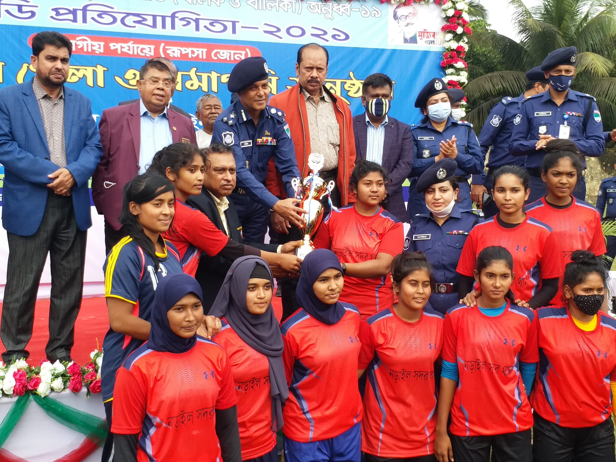 অদ্য ০৯/১২/২০২১খ্রিঃ সকাল ১০.০০ঘটিকায় বাদশা ফয়সাল ইসলামী ইনস্টিটিউট ঈদগা ময়দানে (মাঠ)যশোর জেলা পুলিশের আয়োজনে আইজিপি কাপ জাতীয় যুব কাবাডি(বালক ও বালিকা) অনূর্ধ্ব-১৯ কাবাডি প্রতিযোগিতার-২০২১ বিভাগীয় পর্যায়ের (রুপসা জোন) ফাইনাল খেলা ও সমাপনী অনুষ্ঠিত হয়। উক্ত অনুষ্ঠানে প্রধান অতিথি হিসাবে উপস্থিত থেকে বিজয়ীদের মাধে পুরস্কার বিতরণ করেন খুলনা রেঞ্জের মাননীয় ডিআইজি ড. খঃ মহিদ উদ্দিন, বিপিএম (বার), মহোদয়। মাননীয় রেঞ্জ ডিআইজি মহোদয় তার বক্তব্যের শুরুতেই উপস্থিত সকলকে মহান বিজয়ের শুভেচ্ছা জানান এবং একই সাথে আজকের খেলায় চ্যাম্পিয়ন ও রানার্সআপ দলকে আন্তরিক অভিনন্দন জানান।তিনি আরো বলেন, শারীরিক সুস্থতার জন্য খেলাধুলার কোন বিপল্প নেই।তিনি বলেন যশোর হলো বাংলাদেশের অন্যতম একটি জেলা আমি আাশা করবো এখান থেকে জাতীয় পর্যায়ের অনেক ভালো-ভালো খেলোয়াড় বেড়িয়ে আসবে। পরিশেষে তিনি কোন প্রকার মাদক ও অপরাধের সাথে জড়িত না হওয়ার জন্য উপস্থিত সকলকে অনুরোধ জানান।তিনি বলেন, আমরা সকলে মিলে একটা মাদক, সন্ত্রাস ও অপরাধ মুক্ত বাংলাদেশ গড়বো। তিনি এতো সুন্দর একটি কাবাডি টুনামেন্ট সম্পন্ন করার জন্য যশোর জেলার সম্মানিত পুলিশ সুপার জনাব প্রলয় কুমার জোয়ারদার, বিপিএম(বার), পিপিএম মহোদয় সহ আয়োজক কমিটি ও এর সাথে জড়িত সকল সংগঠনের সদস্যবৃন্দকে ধন্যবাদ জানান। অনুষ্ঠানে বিশেষ অতিথি ছিলেন যশোর জেলার সম্মানিত পুলিশ সুপার ও জেলা ক্রীড়া সংস্থার সহ-সভাপতি জনাব প্রলয় কুমার জোয়ারদার, বিপিএম(বার), পিপিএম(বিশেষ কারণে অনুপস্থিত ছিলেন) এবং জনাব হাজী এস এম ইয়াকুব আলী, কার্যনির্বাহী সদস্য, বাংলাদেশ কাবাডি ফেডারেশন, ঢাকা। অনুষ্ঠানটি সঞ্চালনা করেন জনাব মোহাম্মদ বেলাল হোসাইন, অতিরিক্ত পুলিশ সুপার, “ক” সার্কেল, যশোর এবং সভাপতিত্ব করেন জনাব ইয়াকুব কবির, সাধারণ সম্পাদক, জেলা ক্রীড়া সংস্থা, যশোর। এসময় আরো উপস্থিত ছিলেন জনাব জাহিদ হাসান টুকুন, সভাপতি, প্রেসকাব যশোর মহোদয়, জনাব মোহাম্মদ জাকির হোসেন, পুলিশ সুপার, সিআইডি, যশোর মহোদয়, জনাব রেশমা শারমিন, পুলিশ সুপার, পিবিআই, যশোর মহোদয়, জনাব মোহাম্মদ সাইফুল ইসলাম, অতিরিক্ত পুলিশ সুপার,(প্রশাসন ও অপরাধ), যশোর, জনাব মোহাম্মদ জাহাংগীর আলম, অতিরিক্ত পুলিশ সুপার, জেলা বিশেষ শাখা(ডিএসবি), যশোর, বিভিন্ন জেলা হতে আগত জেলা পুলিশের উর্দ্ধতন কর্মকর্তাগণ, স্থানীয় জনপ্রতিনিধিগণ, অংশগ্রহণকারী খেলোয়াড়বৃন্দ, সাংবাদিকবৃন্দ, জেলা পুলিশের উর্দ্ধতন কর্মকর্তাগণ সহ অফিসার ও ফোর্সবৃন্দ।
