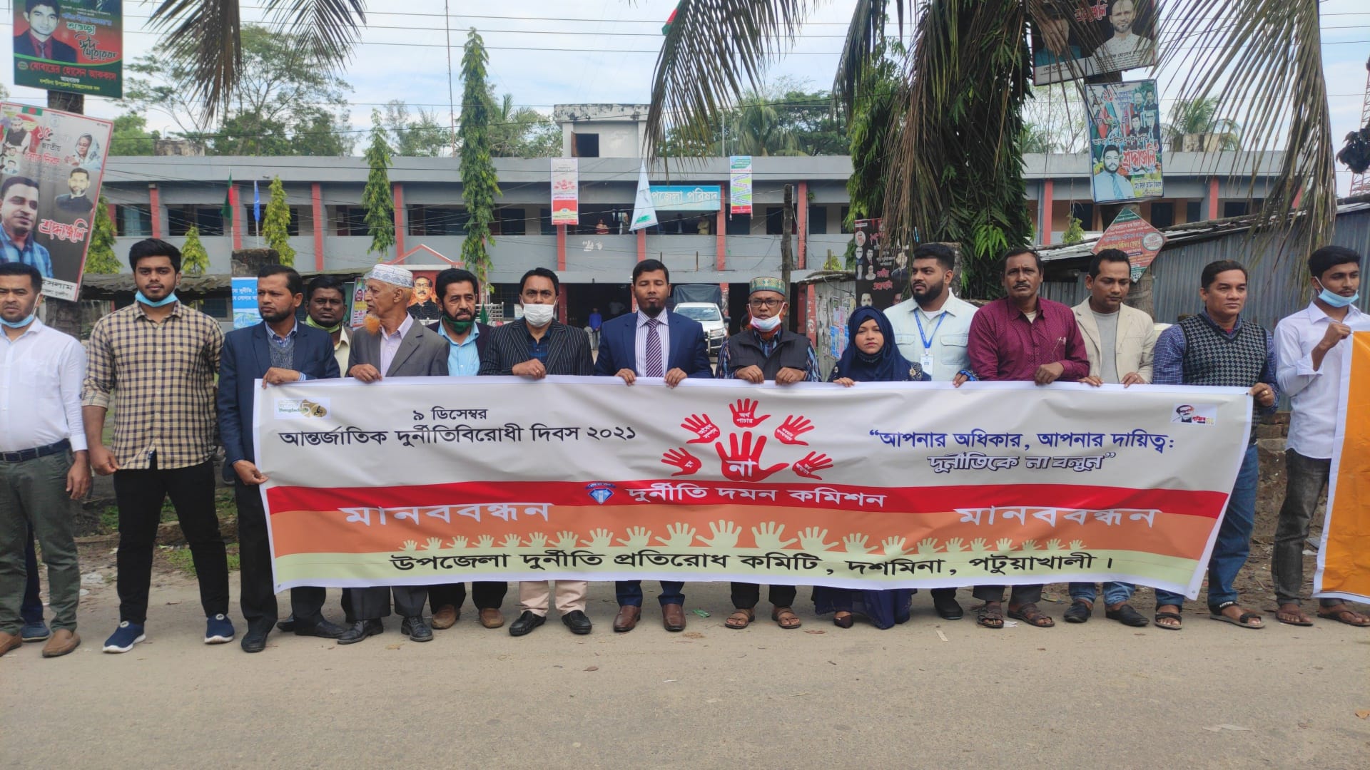 দশমিনা (পটুয়াখালী) সংবাদদাতা : পটুয়াখালীর দশমিনা উপজেলায় গত বৃহস্পতিবার আন্তর্জাতিক দূর্নীতি বিরোধী দিবস পালন করা হয়। আপনার অধিকার,আপনার দায়িত্ব,দূর্নীতিকে না বলুন এই শ্লোগানকে সামনে রেখে দিবসটি যথাযথভাবে পালন করা হয়। দিবসটি পালন উপলক্ষ্যে উপজেলা পরিষদ চত্বরে জাতীয় পতাকা,দুদক পতাকা উত্তোলন ও জাতীয় সংগীত পরিবেশন করা হয়। দূর্নীতি দমন কমিশন ও উপজেলা দূর্নীতি প্রতিরোধ কমিটির যৌথ আয়োজনে পরিষদের হল রুমে উপজেলা দূর্নীতি প্রতিরোধ কমিটির উদ্যোগে এক আলোচনা সভা অনুষ্ঠিত হয়। সভায় প্রধান অতিথি ছিলেন উপজেলা নির্বাহী কর্মকর্তা মোঃ আবদুল কাইয়ুম। সভায় বিশেষ অতিথি ছিলেন উপজেলা কৃষি কর্মকর্তা কৃষিবিদ মোহাম্মদ জাফর আহমেদ। উপজেলা দূর্নীতি প্রতিরোধ কমিটির সভাপতি ও দৈনিক সংবাদ প্রতিনিধি আহাম্মদ ইব্রাহিম অরবিল’র সভাপতিত্বে সভায় উপস্থিত ছিলেন দূর্নীতি প্রতিরোধ কমিটির সাধারন সম্পাদক মোঃ মোশাররফ হোসেন,মহিলা বিষয়ক কর্মকর্তা জেসমিন আক্তার,ব্রাক আইন সহায়িকা উল্কা বিশ্বাস, প্রতিরোধ কমিটির সদস্য মোঃ মোয়াজ্জেম হোসেন আলতাফ মিয়া, মোর্শেদা বেগম, দৈনিক যুগান্তর প্রতিনিধি এইচ.এম.ফোরকান, তাহমিনা সুলতানা, কেয়া বেগম,বিপ্লব কুমার দেবনাথ প্রমুখ। সভা শেষে দূর্নীতি বিরোধী গান পরিবেশন করা হয়।
