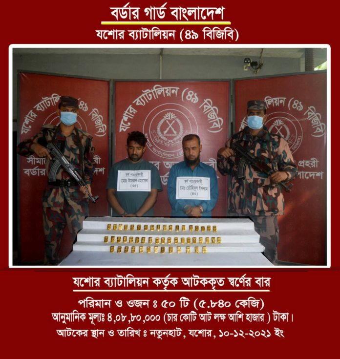 যশোরে ৬কেজি কেজি ওজনের ৫০ টি স্বর্ণের বারসহ ০২ জন আসামী আটক