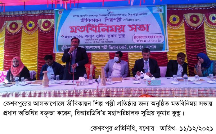 কেশবপুর ব্যুারো : কেশবপুর উপজেলার আলতাপোল গ্রামে শিল্প পাড়া এলাকায় জীবিকায়ন শিল্প পল্লী হিসেবে প্রতিষ্ঠার জন্য এক মতবিনিময় সভা অনুষ্ঠিত হয়েছে। শনিবার দুপুরে উপজেলা পল্লী উন্নয়ন বোর্ডের উদ্যোগে উপজেলার আলতাপোল মাধ্যমিক বিদ্যালয়ের মাঠে এক মতবিনিময় সভা অনুষ্ঠিত হয়। উপজেলা নির্বাহী কর্মকর্তা এম এম আরাফাত হোসেনের সভাপতিত্বে সভায় প্রধান অতিথির বক্তৃতা করেন, বাংলাদেশ পল্লী উন্নয়ন বোর্ডের মহাপরিচালক (গ্রেড-১) সুপ্রিয় কুমার কুন্ডু। উপজেলা পল্লী উন্নয়ন কর্মকর্তা সুলতানা নাছরীনের সঞ্চালনায় অন্যান্যের মধ্যে বক্তব্য দেন, পল্লী জীবিকায়ন প্রকল্পের প্রকল্প পরিচালক আলমগীর হোসেন আল নেওয়াজ, যশোর জেলা বিআরডিবি’র উপপরিচালক কামরুজ্জামান, খুলনার উপপরিচালক আশরাফুল ইসলাম, পল্লী প্রগতি প্রকল্পের প্রকল্প পরিচালক আলাউদ্দিন সরদার, উপজেলা পরিষদের ভাইস চেয়ারম্যান নাসিমা সাদেক ও পলাশ কুমার মল্লিক, উপজেলা আওয়ামী লীগের সাংগঠনিক স¤পাদক গৌতম রায়, সহকারী পল্লী উন্নয়ন কর্মকর্তা সুজন কুমার চন্দ্র প্রমুখ। মুক্ত আলোচনায় কুটির শিল্পের সঙ্গে জড়িতদের ভেতর বক্তব্য দেন, শফিকুল ইসলাম, সাবিনা বেগম, মন্টু মিয়া ও লিপিকা বেগম। তাঁরা বিআরডিবি’র মাধ্যমে কুটির শিল্প বিদেশে রপ্তানির ব্যবস্থা করাসহ স্বল্প মুনাফায় একক ঋণের কথা তুলে ধরেন। আলোচনা শেষে বিআরডিবি’র মহাপরিচালক সুপ্রিয় কুমার কুন্ডুসহ অতিথিবৃন্দরা এলাকায় তৈরি হওয়া কুটির শিল্প ঘুরে দেখেন।