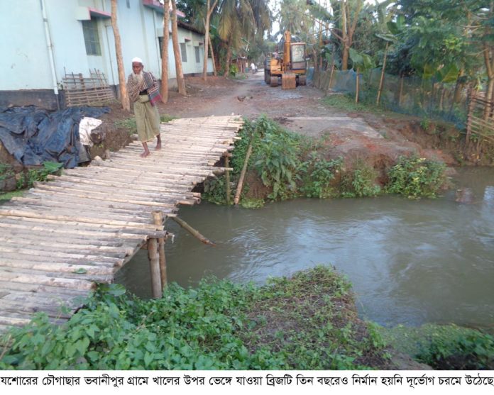 এম হাসান মাহমুদ চৌগাছা (যশোর) ॥ যশোরের চৌগাছার পাতিবিলা ইউনিয়নের ভবানীপুর গ্রামের পাশ দিয়ে বয়ে চলা একটি খালের উপর ৩ বছর ধরে একটি ব্রিজ ভেঙ্গে আছে। স্থানীয়রা চলাচলের জন্য ভাঙ্গা ব্রিজের উপর যেনতেন ভাবে সাকো তৈরী করে ঝুকি নিয়ে চলাচল করছেন। বছরের পর বছর পার হলেও নতুন ব্রিজ নির্মানে কোন উদ্যোগ গ্রহন না করায় স্থানীয়দের মাঝে চরম ক্ষোভের সৃষ্টি হয়েছে। এলাকাবাসি জনগুরুত্বপূর্ণ ব্রিজটি দ্রুত নির্মানের দাবি জানিয়েছেন।ভবানীপুর গ্রামের পাশ দিয়ে প্রবাহমান বুড়ি ভৈরব নদ। নদের তীরে অবস্থিত গ্রামটির মাঝ দিয়ে একটি খাল উত্তরে মাঠের সাথে মিশে গেছে। বর্ষা হলেই পাশ্ববর্তী তেঘরী, মুক্তদাহ, জগদীশপুর গ্রাম ও মাঠের পানি এই খাল দিয়ে পাশে বুড়ি ভৈরব নদে এসে পড়ে। স্থানীয়রা খালটিকে ভবানীপুর খাল হিসেবে চেনেন। ভবানীপুর গ্রামবাসি সহ পাশ্ববতী গ্রামের মানুষের চলাচলের জন্য বহু বছর আগে খালের উপর একটি ব্রিজ নির্মিত হয়। ফলে কৃষকদের মাঠের ফসল ঘরে তোলা, ছোট্ট শিশুদের স্কুলে যাতায়াত করায় আমুল পরিবর্তন আসে। কিন্তু ২০১৯ সালে হঠাৎ করেই ব্রিজটি ভেঙ্গে পড়ে। সাথে সাথে মানুষের অভাবনীয় দূর্ভোগ দেখা দেয়। গ্রামের মানুষ বলাচলে অনেকটাই ঘরবন্দি হয়ে পড়েন। একপর্যায় স্থানীয় যুবকদের সহযোগীতায় যেনতেন ভাবে ভাঙ্গা ব্রিজের উপর একটি বাঁশের সাকো তৈরী করেন। এই সাকো দিয়ে জীবনে ঝুকি নিয়ে কোমলমতি শিশুসহ সকলেই গত তিন বছর ধরে চলাচল করছেন। ব্রিজটি ভেঙ্গে যাওয়ার সাথে সাথে গ্রামের অনেকেই স্থানীয় জনপ্রতিনিধিসহ উপজেলা প্রকৌশল অফিসকে অবহীত করেন। অনেকেই ঘটনাস্থল পরিদর্শন করেছেন আশ্বাস দিয়েছেন কিন্তু তিন বছরেও সেই আশ্বাস পুরোন হয়নি অভিযোগ গ্রামবাসির।শনিবার সরেজমিন যেয়ে দেখা গেছে, খালটি দিয়ে প্রবল স্রোতে পানি নামছে পাশে বুড়ি ভৈরব নদে। ভাঙ্গা ব্রিজের উপর বাঁশের সাকো আছে ঠিকই কিন্তু মেরামতের অভাব এক দিকে হেলে পড়েছে। সেই হেলে পড়া সাকো দিয়ে বয়োবৃদ্ধ, শিশুরা পারাপার হচ্ছেন। পানির প্রবল স্রোতে খালের পূর্বপাশে জৈনক সিরাজুল ইসলামের বসত বাড়িও বর্তমানে হুমকির মুখে। এসময় কথা হয় গ্রামের ব্রিজ সংলগ্ন বাসিন্দা সিরাজুল ইসলামের সাথে। তিনি বলেন, কয়েক গ্রামের মাঠ ঘাটের পানি এই খাল দিয়ে পাশে নদে নামে। প্রতি বছর বর্ষায় প্রবল স্রোতের সৃষ্টি হয়, এতে করে খালের পাশের মাটি ভেঙ্গে খাল পাড়ের বসতবাড়ি হুমকির মুখে পড়েছে। বিশেষ করে গত কয়েক দিনের বৃষ্টিতে ভাঙ্গা ব্রিজের পাশেই একটি বাড়ি চরম হুমকির মুখে রয়েছে। ভবানীপুর গ্রামের হাফিজুর রহমান, হচেন আলী, সানাউল্লাহ বলেন, কৃষকের মাঠের ফসল ঘরে তোলার একটি মাত্র রাস্তা, সেই রাস্তার ব্রিজ গত ৩ বছর ধরে ভেঙ্গে রয়েছে অথচ নির্মা