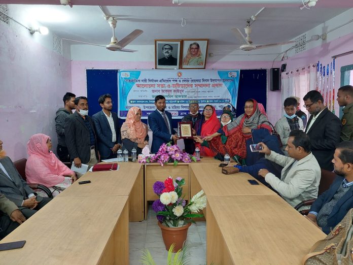 দশমিনা (পটুয়াখালী) সংবাদদাতা : পটুয়াখালী দশমিনা উপজেলায় মহিলা অধিদপ্তরের উদ্যোগে আন্তর্জাতিক নারী নির্যাতন প্রতিরোধ পক্ষ ও বেগম রোকেয়া দিবস উদযাপন উপলক্ষে ৫জয়িতাদের সম্মাননা প্রদান করা হয়। উপজেলা মহিলা বিষয়ক কর্মকর্তা মোসাঃ জেসমিন বেগম এর সঞ্চালনায় প্রধান অতিথি হিসাবে উপস্থিত ছিলেন উপজেলা নির্বাহী কর্মকর্তা (ভারপ্রাপ্ত) মোঃ আবদুল কাইয়ূম। বিশেষ অতিথি হিসাবে উপস্থিত ছিলেন উপজেলা কৃষি কর্মকর্তা কৃষিবিদ মোঃ জাফর আহমেদ, প্রেসকাবের সিনিয়র সহ-সভাপতি ও দৈনিক সংবাদ প্রতিনিধি আহাম্মদ ইব্রাহিম অরবিল, উপজেলা মহিলা আওয়ামী লীগের সভানেত্রী ফাতেমা আলমগীর প্রমূখ। উপজেলায় অর্থনৈতিক ভাবে সাফল্য অর্জনকারী নারী উপজেলার বহরমপুর ইউনিয়নের মতিয়ার রহমানের কন্যা মোসাঃ সালেহা বেগম,সমাজ উন্নয়নে অবদান রাখায় রনগোপালদী ইউনিয়নের মৃত. মোসলেম গাজীর কন্যা তহমিনা আক্তার, সফল জননী হিসাবে দশমিনা ইউনিয়নের মোঃ বেলায়েত হোসেনের স্ত্রী মনোয়ারা বেগম, শিক্ষা ও চাকুরী ক্ষেত্রে সাফল্য অর্জনকারি দশমিনা ইউনিয়নের মোঃ খাইরুল ইসলামের স্ত্রী মোসাঃ শামসুর নেহার ডলি, নির্যাতনের গ্লানি মুছে ফেলে নতুন উদ্যামে জীবন শুরু করেন বাশঁবাড়িয়া ইউনিয়নের শহিদুল খানের কন্যা মোসাঃ খাদিজা বেগমকে অনুষ্ঠানের প্রধান অতিথি পাঁচ ক্যাটাগরিতে ৫ জনকে এই সম্মাননা তুলে দেয়া হয়।
