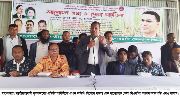 বাগেরহাট ব্যুরো : জাতীয়তাবাদী কৃষকদলের ৪১তম প্রতিষ্ঠা বার্ষিকী উপলক্ষে বাগেরহাটে আলোচনা সভা ও দোয়া মাহফিল অনুষ্ঠিত হয়েছে। দিনটি উপলক্ষে শনিবার দুপুরে বাগেরহাট শহরের সম্মিলনি মোড়স্থ জেলা বিএনপির কার্যালয়ে কৃষকদলের আয়োজনে এই কর্মসূচি পালন করা হয়। বাগেরহাট জেলা কৃষকদলের আহবায়ক আসাফউদ্দৌলা জুয়েলের সভাপতিত্বে ও যুগ্ম আহবায়ক ফকির তৌহিদুল ইসলাম এর সঞ্চালনায় উক্ত আলোচনা সভায় প্রধান অতিথি হিসাবে উপস্থিত ছিলেন,বাগেরহাট জেলা বিএনপির সাবেক সভাপতি জননেতা এম.এ সালাম। আলোচনা সভায় অন্যান্যদের মধ্যে বক্তব্য রাখেন,বাগেরহাট জেলা বিএনপির আহবায়ক কমিটির সদস্য এ্যাড. আসাদুজ্জামান,শেখ শাহেদ আলী রবি,অধ্যাপক হাদিউজ্জামান হিরো, মেহেবুবুল হক কিশোর, বাগেরহাট জেলা জাতীয়তাবাদী আইনজীবী ফোরামের সাবেক সভাপতি হাওলাদার আব্দুল মান্নান, বিএনপি নেতা শহিদুল ইসলাম স্বপন, শ্রমিক নেতা এলাহী মল্লিক আলম, মো: আবু হানিফ,যুবদল নেতা জয়নাল পারভেজ সুমন, গোলাম রসুল মুন্না প্রমুখ। আলোচনা সভা শেষে বিএনপির চেয়ারপার্সন বেগম খালেদা জিয়ার মুক্তি ও সুস্থ্যতা কামনায় বিশেষ দোয়া ও মোনাজাত পরিচালনা করেন মাওলানা আবুবক্কর।