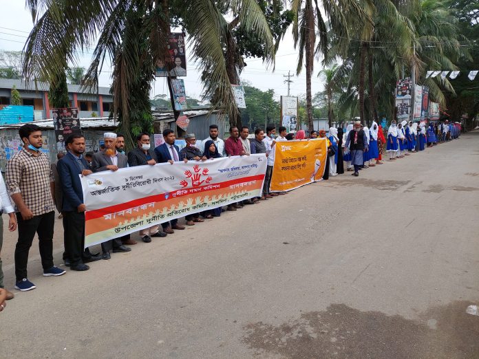 দশমিনা (পটুয়াখালী) সংবাদদাতা : পটুয়াখালীর দশমিনায় আন্তর্জাতিক দূর্নীতি বিরোধী দিবস উপলক্ষ্যে উপজেলা দূর্নীতি প্রতিরোধ কমিটির আয়োজনে গতকাল রবিবার সকালে পরিষদের সামনে দূর্নীতি বিরোধী এক মানববন্ধন অনুষ্ঠিত হয়। উপজেলা দূর্নীতি প্রতিরোধ কমিটির সভাপতি ও দৈনিক সংবাদ প্রতিনিধি আহাম্মদ ইব্রাহিম অরবিলের নেতৃত্বে এই মানববন্ধন অনুষ্ঠিত হয়। মানববন্ধনে প্রধান অতিথি ছিলেন উপজেলা নির্বাহী কর্মকর্তা মোঃ আবদুল কাইয়ুম। বিশেষ অতিথি হিসাবে ছিলেন উপজেলা কৃষি কর্মকর্তা মোঃ জাফর আহমেদ, দূর্নীতি প্রতিরোধ কমিটির সদস্য ও দৈনিক যুগান্তর প্রতিনিধি এইচ.এম.ফোরকান, দূর্নীতি প্রতিরোধ কমিটির সাধারন সম্পাদক মোঃ মোশাররফ হোসেন, দৈনিক নয়াদিগন্ত ও এসটিভির প্রতিনিধি সঞ্জয় ব্যানার্জি, দৈনিক বাংলাদেশের খবর প্রতিনিধি সাইদুর রহমান সাঈদ,দৈনিক আজকের পত্রিকার প্রতিনিধি মোঃ বেল্লাল হোসেন প্রমুখ।