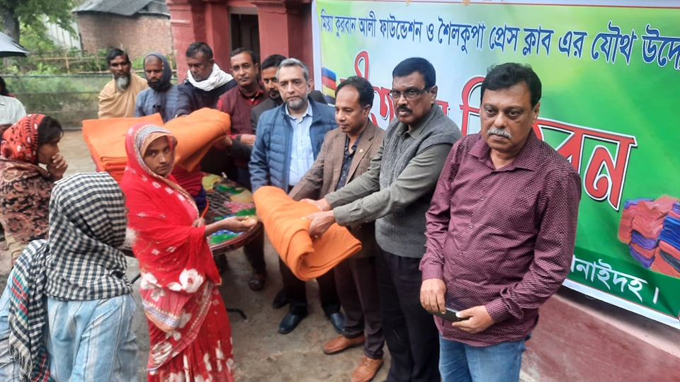 শৈলকুপা(ঝিনাইদহ) প্রতিনিধি ঃ শীতে কাঁপছে দেশ। অসহায় দুস্থ্য মানুষ। এমন সময় শীতবস্ত্র নিয়ে অসহায় মানুষের পাশে দাঁড়িয়েছে মিয়া কুরবান আলী ফাউন্ডেশন। শনিবার ঝিনাইদহের শৈলকুপা উপজেলার উত্তর মির্জাপুর গ্রামে কুরবান আলী ফাউন্ডেশন ও শৈলকুপা প্রেসকাবের যৌথ উদ্যোগে প্রায় ২ শতাধিক শীতার্ত দুস্থ্য মানুষের মাঝে শীতবস্ত্র হিসেবে কম্বল বিতরণ করা হয়।এসময় মিয়া কুরবান আলী ফাউন্ডেশনের পক্ষ থেকে দুস্থ্যদের মাঝে কম্বল তুলে দেন আসাদুজ্জামান সেলিম মিয়া,মহিদুজ্জামান কচি মিয়া,বাবু মিয়া,শৈলকুপা প্রেসকøাবের পক্ষ থেকে শাহীন আক্তার পলাশ,আব্দুর রহমান মিল্টন,তাজনুর রহমান ডাবলু,মফিজুল ইসলাম,শেখ ইমন প্রমূখ। শীতবস্ত্র পেয়ে খুশি শীতার্ত দুস্থ্যও অসহায় গরীব মানুষেরা। আসাদুজ্জামান সেলিম মিয়া জানান,প্রতিবছরের ন্যায় এবারও মিয়া কুরবান আলী ফাউন্ডেশন এর পক্ষ থেকে দুস্থ্যদের মাঝে কম্বল দেওয়া হয়েছে। এলাকার অসহায় গরীব মানুষের মাঝে শীতবস্ত্র দিতে পেরে নিজেদের কাছে খুশি লাগছে। এ ধারা অব্যাহত থাকবে বলেও তিনি জানান।