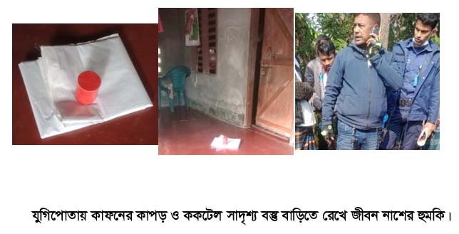 সাতক্ষীরা প্রতিনিধি ঃ সাতক্ষীরার সদর উপজেলার ধুলিহর ইউনিয়নের যুগীপোতা গ্রামে কে বা কারা কাফনের কাপড় ও ককটেল সাদৃশ্য বস্তু বাড়িতে রেখে হুমকি প্রদানের খবর পাওয়া গেছে। জানা গেছে ঐ গ্রামের মৃত আলি একব্বরের পুুত্র আব্দুল হামিদ ( ৪০) এর বাড়িতে শনিবার দিবাগত রাতে কে বা কারা কাফনের কাপড় ও ককটেল সাদৃশ্য বস্তু রেখে যায়। সকালে আব্দুল হামিদের স্ত্রী মোছাঃ রোজিনা খাতুন (৩৫) ভোরে ঘুম থেকে উঠে ঘরের বারান্দায় দেখতে পেয়ে ডাক চিৎকার দিলে আব্দুল হামিদ সহ প্রতিবেশিরা ছুটে আসে এবং স্থানীয় মেম্বর তপন শীল পুলিশ কে খবর দেয়। এসময় ব্রহ্মরাজপুর পুলিশ ক্যাম্প ইনচার্জ এস আই তন্ময় এবং এ এস আই আজিম ঘটনাস্থলে গিয়ে উক্ত কাফনের কাপড় এবং ককটেল সাদৃশ্য বস্তু উদ্ধার করে সাতক্ষীরা সদর থানায় নিয়ে যায়। এ ব্যাপারে এস আই তন্ময় জানান বিষয়টি ওসি সাহেব অবগত আছেন এবং তিনি আইনআনুগ ব্যবস্থা নিবেন।