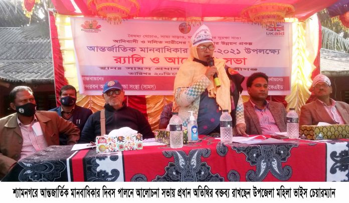 শ্যামনগর ব্যুরো ঃ “বৈষম্য ঘোচাও, সাম্য বাড়াও, মানবাধিকারের সুরক্ষা দাও”- এ প্রতিপাদ্যকে সামনে নিয়ে সুন্দরবন আদিবাসী সংস্থা (সাম্স) এর আয়োজনে মানুষের জন্য ফাউন্ডেশনের সহযোগিতায় ও ইউকেএইড এর অর্থায়নে শ্যামনগরে আন্তজার্তিক মানবাধিকার দিবস-২০২১ পালন উপলক্ষ্যে র‌্যালি ও আলোচনা সভা অনুষ্ঠিত হয়েছে। গতকাল সোমবার সকাল ১১ টায় শ্যামনগর টু মুন্সিগঞ্জ প্রধান সড়কে র‌্যালি শেষে শ্যামনগর উপজেলার সামস্রে প্রধান কার্যালয়ে আদীবাসী ও দলিত নারীদের মানবাধিকার উন্নয়নে আন্তজার্তিক মানবাধিকার দিবস পালন অনুষ্ঠানে গোপাল চন্দ্র মন্ডলের সভাপতিত্বে স্বাগত বক্তব্য রাখেন সামস্রে নির্বাহী পরিচালক কৃষ্ণপদ মুন্ডা। প্রধান অতিথির বক্তব্য রাখেন, উপজেলা মহিলা ভাইস চেয়ারম্যান খালেদা আইয়ুব ডলি। বিশেষ অতিথির বক্তব্য রাখেন, উপজেলা ভাইস চেয়ারম্যান প্রভাষক সাঈদ উজ জামান সাঈদ, সামস্রে হিতাকাক্ষী ফাদার লুইজি পাজ্জি, মাঠকর্মী তারাপদ মুন্ডা, অসিত কুমার মুন্ডা, গোবিন্দ কুমার দাশ। আরও বক্তব্য রাখেন, পুর্নিমা মুন্ডা, ভগবতী মুন্ডা, বিথি মুন্ডা, আনন্দনী মুন্ডা প্রমুখ। বক্তাগণ তাদের বক্তব্যের মধ্যে বলেন, মুন্ডা সম্প্রদায়ের অধিকার ও স্বাধীনতা রক্ষাকল্পে বৈষম্য থেকে মুক্তি পাওয়ার অধিকার, জীবন, স্বাধীনতা ও ব্যক্তিগত নিরাপত্তার অধিকার, দাসত্ব থেকে মুক্তির অধিকার, নির্যাতন ও অবমুল্যায়ন থেকে মুক্তি পাওয়ার অধিকার, আদালত থেকে ন্যায্য বিচার পাওয়ার অধিকার, সামাজিক নিরাপত্তার অধিকার, শিক্ষার অধিকার সহ ৩০ টি অধিকারের দাবি জানান।