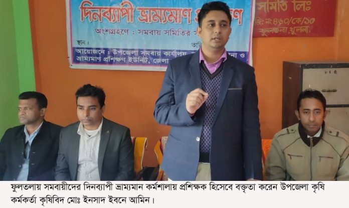 ফুলতলা (খুলনা) প্রতিনিধি : খুলনা জেলা ও ফুলতলা উপজেলা সমবায় কার্যালয়ের উদ্যোগে সমবায়ীদের টেকসই উন্নয়নে সমবায় ব্যবস্থাপনা বিষয়ক দিনব্যাপী ভ্রাম্যমান প্রশিক্ষণ কর্মশালা মঙ্গলবার সকাল ১০টায় জনকল্যাণ বহুমূখী সমবায় সমিতির মিলনায়তনে অনুষ্ঠিত হয়। উপজেলা সমবায় কর্মকর্তা খন্দকার জহিরুল ইসলামের সভাপতিত্বে অনুষ্ঠিত কর্মশালায় প্রশিক্ষক ছিলেন উপজেলা কৃষি কর্মকর্তা কৃষিবিদ মোঃ ইনসাদ ইবনে আমিন, জেলা সমবায় কার্যালয়ের সহকারী প্রশিক্ষক মোঃ ইকলাস উদ্দিন। অন্যান্যের মধ্যে বক্তৃতা করেন কেন্দ্রীয় সমবায় সতিমির সভাপতি মাহফুজুর রহমান, উপজেলা প্রেসকাব সভাপতি শামসুল আলম খোকন, সমবায়ী নেতা মঞ্জুরুল হাসান, বিঞ্নু দাস, আবিদ হাসান, মাহমুদা ইসলাম, রমজান মাহমুদ অরন্য প্রমুখ। কর্মশালায় কৃষি, মৎস্য চাষ এবং মার্কেটিং বিষয়ে সমবায়ীদের ধারনা দেয়া হয়।