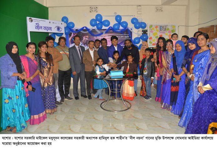 স্টাফ রিপোর্টার : ব্যতিক্রমী একজন শিক্ষক যশোর সরকারি মাইকেল মধুসূদন কলেজের সহকারী অধ্যাপক হামিদুল হক শাহীন। নানান সামাজিক কাজ করে পরিচিতি পাওয়া গুণী এই শিক্ষক এবার নিজে গান লিখে সুর করে কণ্ঠ দিয়েছেন। সোমবার আনুষ্ঠানিকভাবে তার লেখা, সুর ও গাওয়া গান ‘নীল নয়না’ মুক্তি পেয়েছে। সন্ধ্যায় সামাজিক যোগাযোগ মাধ্যম ফেসবুক ও ইউটিউবে মুক্তির পর গানটি আলোড়ন সৃষ্টি করেছে। সকল শ্রেণির দর্শক উচ্চসিত প্রশংসা করেছেন। গানের শুভ মুক্তি উপলক্ষ্যে সহকারী অধ্যাপক হামিদুল হক শাহীনের বন্ধু মহলের উদ্যোগে সোমবার বিকেলে শহরের খড়কিতে আইডিয়া সমাজ কল্যাণ সংস্থার কার্যালয়ে ঘরোয়া অনুষ্ঠানের আয়োজন করা হয়। অনুষ্ঠানে উপস্থিত ছিলেন সংগীত শিল্পী মোল্লা বাবু, সংগীত পরিচালক সুজন সুহৃদ, সাংবাদিক মিলন রহমান, তৌহিদ জামান, ইন্দ্রজিৎ রায় প্রমুখ।