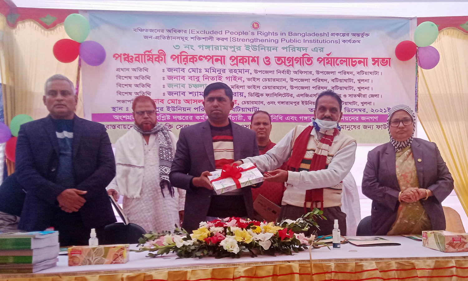 বটিয়াঘাটা (খুলনা) প্রতিনিধি : বটিয়াঘাটার গঙ্গারামপুর ইউনিয়ন পরিষদের আয়োজনে গতকাল বুধবার সকাল সাড়ে ১০ টায় স্থানীয় পরিষদ চত্বরে ইউপি চেয়ারম্যান মোঃ আসলাম হালদারের সভাপতিতে এবং মানুষের জন্য ফাউন্ডেশন ও মুক্তি সেবা সংস্থার বাস্তবায়নে ইউনিয়নের পঞ্চবার্ষিকী পরিকল্পনা প্রকাশ ও অগ্রগতি পর্যলোচনা বিষয়ক সভা অনুষ্ঠিত হয়। কেএমএসএস এর ম্যানেজার শামীমা পারভীন এর সঞ্চলনায় অনুষ্ঠিত সভায় প্রধান অতিথি ছিলেন ভাইস চেয়ারম্যান নিতাই গাইন। বিশেষ অতিথি ছিলেন মহিলা ভাইস চেয়ারম্যান চঞ্চলা মন্ডল, এলজিএসপির ফ্যাসিলিটেটর শ্যামল কুমার রায়, কেএমএসএস এর নির্বাহী পরিচালক আফরোজা আক্তার মঞ্জু। সভায় অন্যান্যের মধ্যে উপস্থিত ছিলেন উপজেলা প্রেসকাবের সাধারণ সম্পাদক ইন্দ্রজিৎ টিকাদার, সাংবাদিক মোঃ শরিফুল ইসলাম (বাবু), সাংবাদিক সুমন বিশ্বাস, সচিব পঙ্কজ কুমার সরকার, প্যানেল চেয়ারম্যান ইউপি সদস্য মোঃ সেলিম হোসেন রাহাত, দুলাল মহালদার, সেলিনা আক্তার পলি, ইউপি সদস্য যথাক্রমে মোঃ মনিরুল ইসলাম, মলিনা রায়, মোঃ মোশারেফ হোসেন, মোঃ ফেরদৌস মোলঙ্গী, নাগরিক নেত্রী বন্ধনা রায়, কাজী বাবর আলী, মাওঃ আবু মুছা সহ সকল গ্রাম পুলিশ সদস্যবৃন্দ ও গন্যমান্য ব্যক্তিবর্গ।