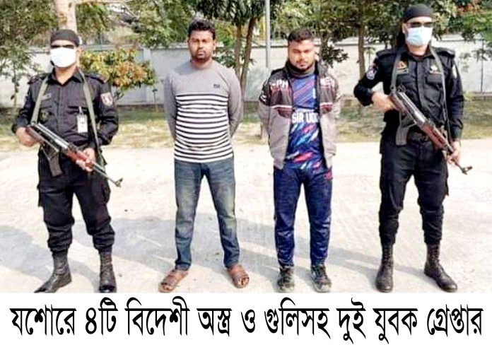 স্টাফ রিপোর্টার : বিদেশী ৪টি অস্ত্র ও ৩৮ রাউন্ড গুলিসহ দুই যুবককে গ্রেপ্তার করেছে র্যাব ৬ এর একটি দল। মঙ্গলবার (২১ ডিসেম্বর) যশোরের বেনাপোল দীঘিরপাড় এলাকা থেকে তাদের রাত সাড়ে নয়টার দিকে গ্রেপ্তার করা হয়। গ্রেপ্তারকৃত যুবকরা হলো যশোর বেনাপোল পুটখালী এলাকার মোঃ আব্দুল মমিনের ছেলে মোঃ আজিজুর রহমান ও একই এলাকার মোঃ আঃ কাদেরের ছেলে মোঃ আব্দুল্লাহ। র্যাব-৬ এর পরিচালক লেঃ কর্ণেল মুহাম্মাদ মোসতাক আহমদ সংবাদ সম্মেলনে সাংবাদিকদের জানান, ওই দিন রাতে মাদকদ্রব্য উদ্ধারের লক্ষে যশোরের বেনাপোল দীঘিরপাড় এলাকার একটি ফিলিং স্টেশনের সামনে অভিযান চালায় র্যাবের একটি টিম। র্যাবের উপস্থিতি দেখে আসামি পালানোর চেষ্টা করে। এ সময় দুই যুবক আটক করা হয়। তাদের দেহ তল্লাশী করে চারটি বিদেশী পিস্তল ও ৩৮ রাউন্ড গুলি উদ্ধার করা হয়। আসামিরা এলাকায় নৈরাজ্য ও বিশৃঙ্খলা সৃষ্টির জন্য অস্ত্র বহন করছিল। জিজ্ঞাসাবাদে তারা গুরুত্বপূর্ণ তথ্য দিয়েছে বলে জানিয়েছেন র্যাবের এই কর্মকর্তা।