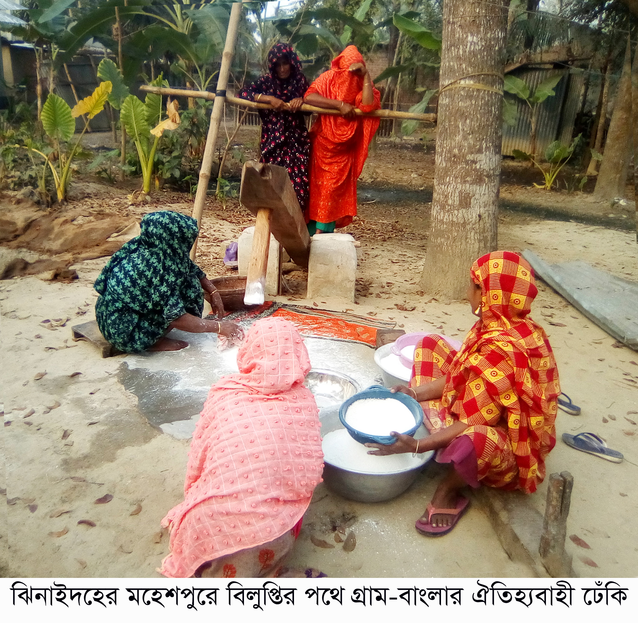 সাইফুল ইসলাম,মহেশপুর(ঝিনাইদহ)অফিস : ও বৌ ধান ভানেরে/ঢেঁকিতে পার দিয়া/ ঢেঁকি নাচে বউ নাচে/ হেলিয়া, দুলিয়া/ ও বৌ ধান ভানেরে পল্লী কবি জসীম উদ্দিনের ঢেঁকি নিয়ে এই কবিতা এখনো থাকলেও নানান স্মৃতির এই ঐতিহ্যবাহী ঢেঁকি এখন প্রায় বিলুপ্তির পথে। গ্রাম-বাংলার ঘরে ঘরে এক সময় ঢেঁকিতে ধান ভানা, চিঁড়া কুটা আর চালের গুঁড়া কুটার দৃশ্য সবসময়ই চোখে পড়তো। কিন্তু কালের বিবর্তন আর আধুনিকতার ছোয়ায় গ্রাম বাংলা থেকে হারিয়ে যাচ্ছে একসময়ের খাদ্যদ্রবাদি মাড়াইয়ের অন্যতম মাধ্যম ঢেঁকি। বর্তমানে মানুষের প্রযুক্তি নির্ভরতা এবং কর্মব্যস্ততা বেড়ে যাওয়ায় ঢেঁকির ব্যবহার এখন নেই বললেও চলে। আধুনিক প্রযুক্তি ব্যবহারের ফলে হারিয়ে যেতে বসেছে এক সময়কার গ্রাম-বাংলার ঐতিহ্য। পাল্টে গেছে গ্রামের চিত্র। এই আধুনিক যন্ত্রপাতি আর প্রযুক্তির আড়ালে চাপা পড়ে গেছে গ্রামের সেই ঐতিহ্যবাহী ঢেঁকি। এখন ঢেঁকির আর দেখাই মেলে না। ‘ধান ভানি রে, ঢেঁকিতে পার দিয়া। ঢেঁকি নাচে আমি নাচি, হেলিয়া-দুলিয়া। ধান ভানি রে।’ গ্রাম-বাংলার তরুণী-নববধূ, কৃষানিদের কণ্ঠে এ রকম গান এখন আর শোনা যায় না। বিভিন্ন ধরনের যন্ত্র আবিষ্কারের সঙ্গে সঙ্গে সেসব পুরনো ঐতিহ্য হারিয়ে যাচ্ছে। কালের বিবর্তনে ঢেঁকি এখন শুধু ঐতিহ্যের স্মৃতি বহন করে। দিন দিন ঢেঁকি শিল্প বিলুপ্ত হলেও একে সংরণের কোনো উদ্যোগ নেই। একসময় ভোরে আজানের সাথে সাথে স্তব্ধতা ভেঙে চারদিকে ছড়িয়ে পড়ত ঢেঁকির শব্দ। পরিবারের নারীরা সে সময় দৈনন্দিন ধান, গম ও যব ভাঙার কাজ ঢেঁকিতেই করতেন। পাশাপাশি চিড়া তৈরির মতো কঠিন কাজও ঢেঁকিতেই করা হতো। বিশেষ করে শবে বরাত, ঈদ, পূজা, নবান্ন উৎসব, পৌষ পার্বণসহ বিশেষ বিশেষ দিনে পিঠা-পুলি খাওয়ার জন্য অধিকাংশ বাড়িতেই ঢেঁকিতে চালের আটা তৈরি করা হতো।