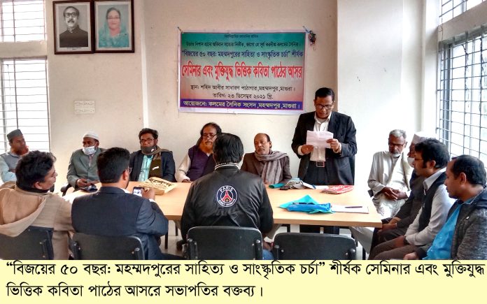 মহম্মদপুর (মাগুরা) প্রতিনিধি : মাগুরার মহম্মদপুরে বৃহস্পতিবার বিকালে স্থানীয় শহিদ আবীর সাধারণ পাঠাগারে “বিজয়ের ৫০ বছর: মহম্মদপুরের সাহিত্য ও সাংস্কৃতিক চর্চ” শীর্ষক সেমিনার এবং মুক্তিযুদ্ধ ভিত্তিক কবিতা পাঠের আসর অনুষ্ঠিত হয়েছে। উপজেলার ঐতিহ্যবাহী সংগঠন কলমের সৈনিক সংসদের আয়োজনে এই সাহিত্য সেমিনার এবং মুক্তিযুদ্ধ ভিত্তিক কবিতা পাঠের আয়োজন করা হয়। আলোচনা শেষে সন্ধ্যায় মুক্তিযুদ্ধ ভিত্তিক কবিতা পাঠ ও সাহিত্য আড্ডা হয়েছে। কলমের সৈনিক সংসদের সাহিত্য সম্পাদক, আমিনুর রহমান কলেজের সহকারী অধ্যাপক জাহাঙ্গীর কবিরের সভাপতিত্বে আলোচনার শুরুতেই স্বাগত বক্তব্য দেন কলমের সৈনিক সংসদের প্রতিষ্ঠাতা, সাপ্তাহিক মহম্মদপুর বার্তা’র সম্পাদক, নাট্যকার ও কবি সালাহ্উদদীন আহমেদ মিলটন। কলমের সৈনিক সংসদের সেক্রেটারী জেনারেল সাংবাদিক মুরাদ হোসেনের সঞ্চালনায় আলোচক হিসেবে উপস্থিত ছিলেন অধ্যক্ষ (অব:) সাহিত্যানুরাগী মোঃ আমিমুল হক। কলমের সৈনিক সংসদের উপদেষ্টা ও আমিনুর রহমান কলেজের বাংলা বিভাগের চেয়ারম্যান মো: ওসমান আলী, সরকারি বঙ্গবন্ধু কলেজের সহকারী অধ্যাপক নিজামউদ্দীন, কবি ও সাহিত্যিক গাজী শামসুজ্জামান, কবি কাজী কামরুল হাসান ফিরোজ, কাজী সামিমা হক মহিলা কলেজের সহকারী অধ্যাপক এ টি এম শহিদুজ্জামান, বসুর ধুলজুড়ি মাধ্যমিক বিদ্যালয়ের প্রধান শিকক্ষ মো: রিয়াজুর রহমান, পলাশবাড়িয়া মাধ্যমিক বিদ্যালয়ের সহকারী প্রধান শিক্ষক মো. শহিদুজ্জামান, শহিদ আবীর সাধারণ পাঠাগারের সদস্য সচিব রফিকুল ইসলাম, প্রেসকাব মহম্মদপুরের সাধারণ সম্পাদক মাহমুদুন নবী, কবি মো. হাবিবুল্লাহ এবং মো. শাহাজাহান মিয়া প্রমূখ। সেমিনারের সার্বিক সহযোগিতায় ছিলেন সাপ্তাহিক মহম্মদপুর বার্তার স্টাফ রিপোর্টার বিশ^জিৎ সিংহ রায়, সাহিত্য সম্পাদক কবি মতিউর রহমান, কলমের সৈনিক সংসদের সদস্য চাষী কবি আকইদ ও কবি লতিফুল খবির।